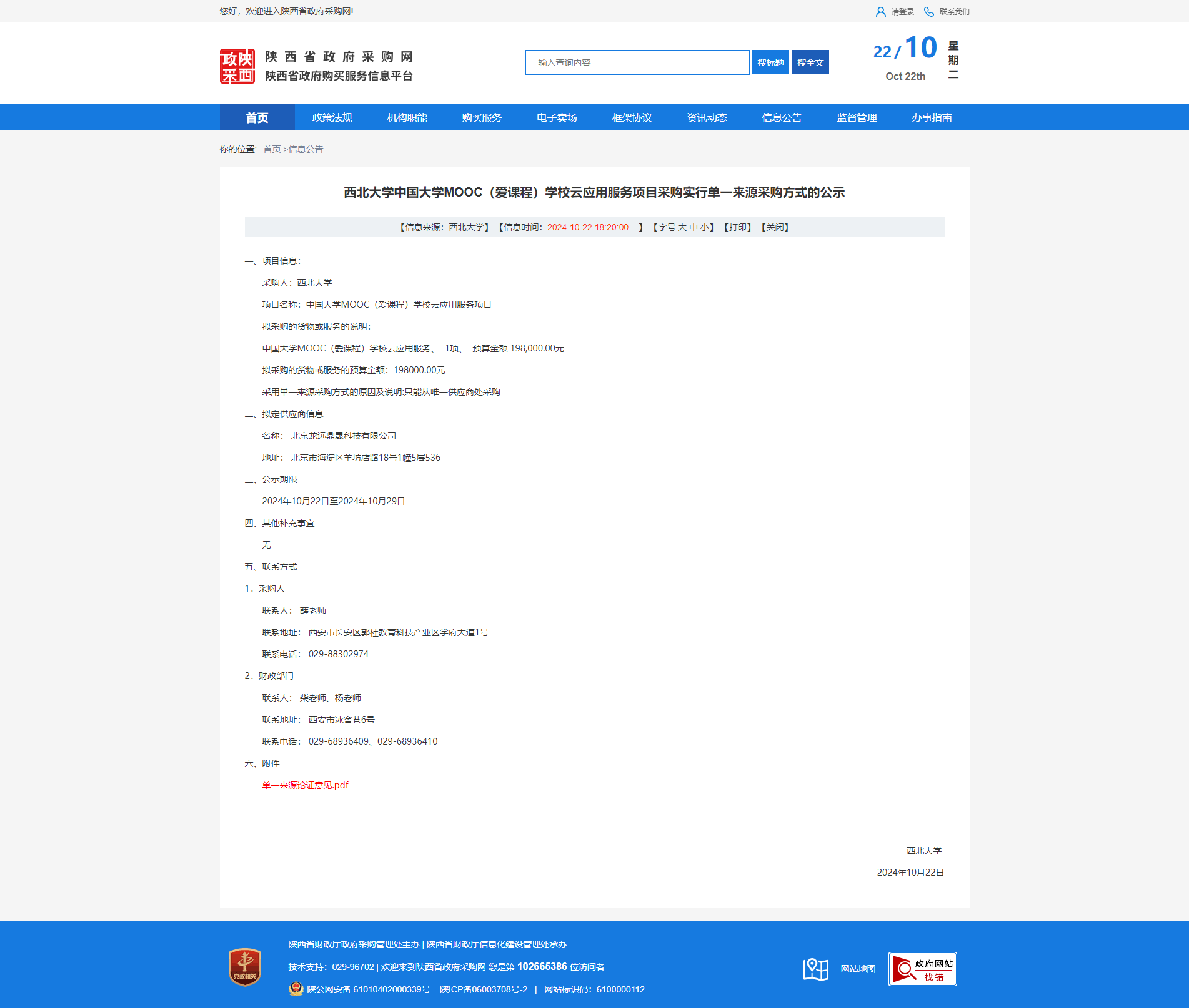 乐投平台中国大学MOOC(爱课程)学校云应用服务项目采购实行单一来源采购方式的公示