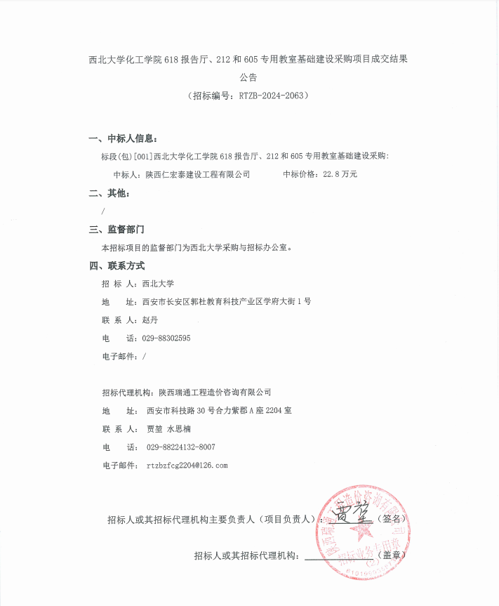 乐投平台化工学院618报告厅、212和605专用教室基础建设采购项目成交结果公告