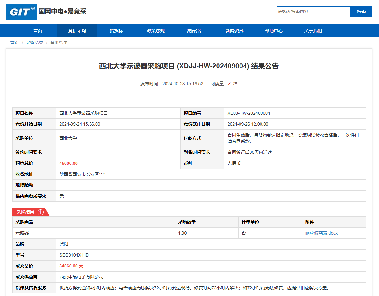 乐投平台示波器采购项目(XDJJ-HW-202409004)竞价结果公告 作者:采购与招标办公室 编辑: 时间:2024-10-23 原公告链接:https://www.ejingcai.com.cn/site/bidding/detail/13693