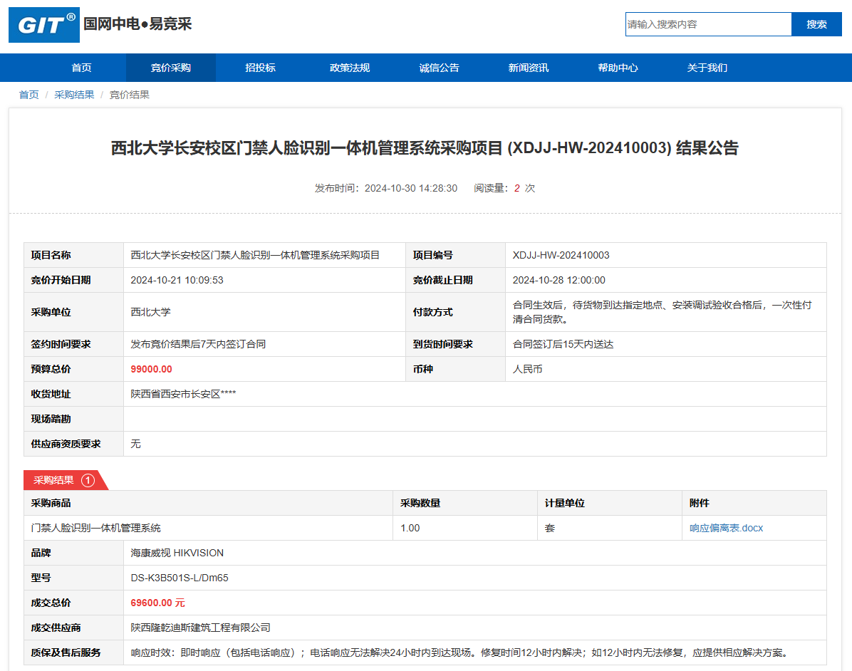 乐投平台长安校区门禁人脸识别一体机管理系统采购项目(XDJJ-HW-202410003)竞价结果公告 作者:采购与招标办公室 编辑: 时间:2024-10-30 原公告链接:https://www.ejingcai.com.cn/site/bidding/detail/14111