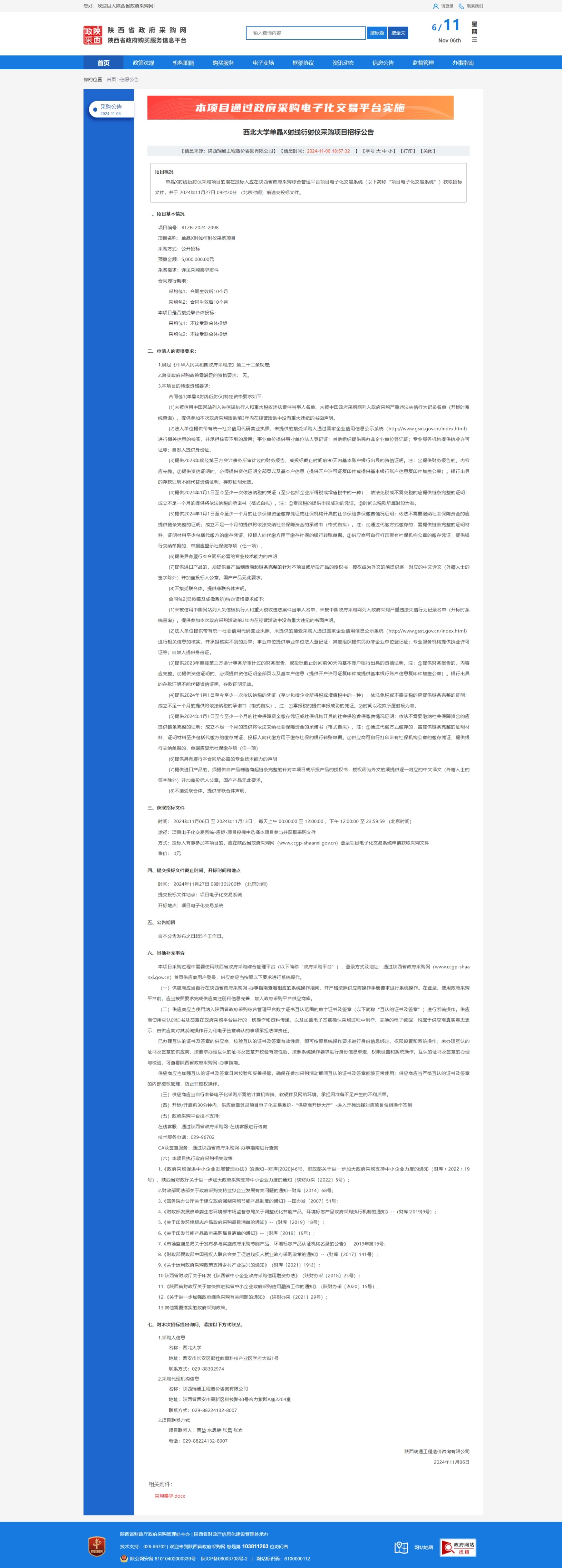 乐投平台单晶X射线衍射仪采购项目招标公告 作者: 编辑:采购与招标办公室 时间:2024-11-06 原公告链接:https://www.ccgp-shaanxi.gov.cn/freecms/site/shaanxi/ggxx/info/2024/8a69c44e9218572b0193011b33fc605b.html?noticeType=001011¬iceId=79ed41b9-9c2f-11ef-8063-08c0eb20c666