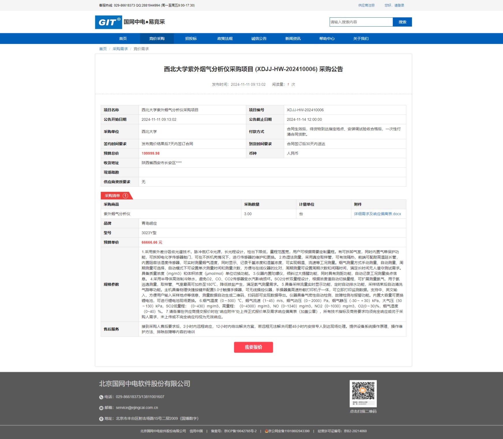 乐投平台紫外烟气分析仪采购项目 (XDJJ-HW-202410006) 竞价采购公告 作者: 编辑:采购与招标办公室 时间:2024-11-11 原公告链接:https://www.ejingcai.com.cn/site/bidding/detail/14592