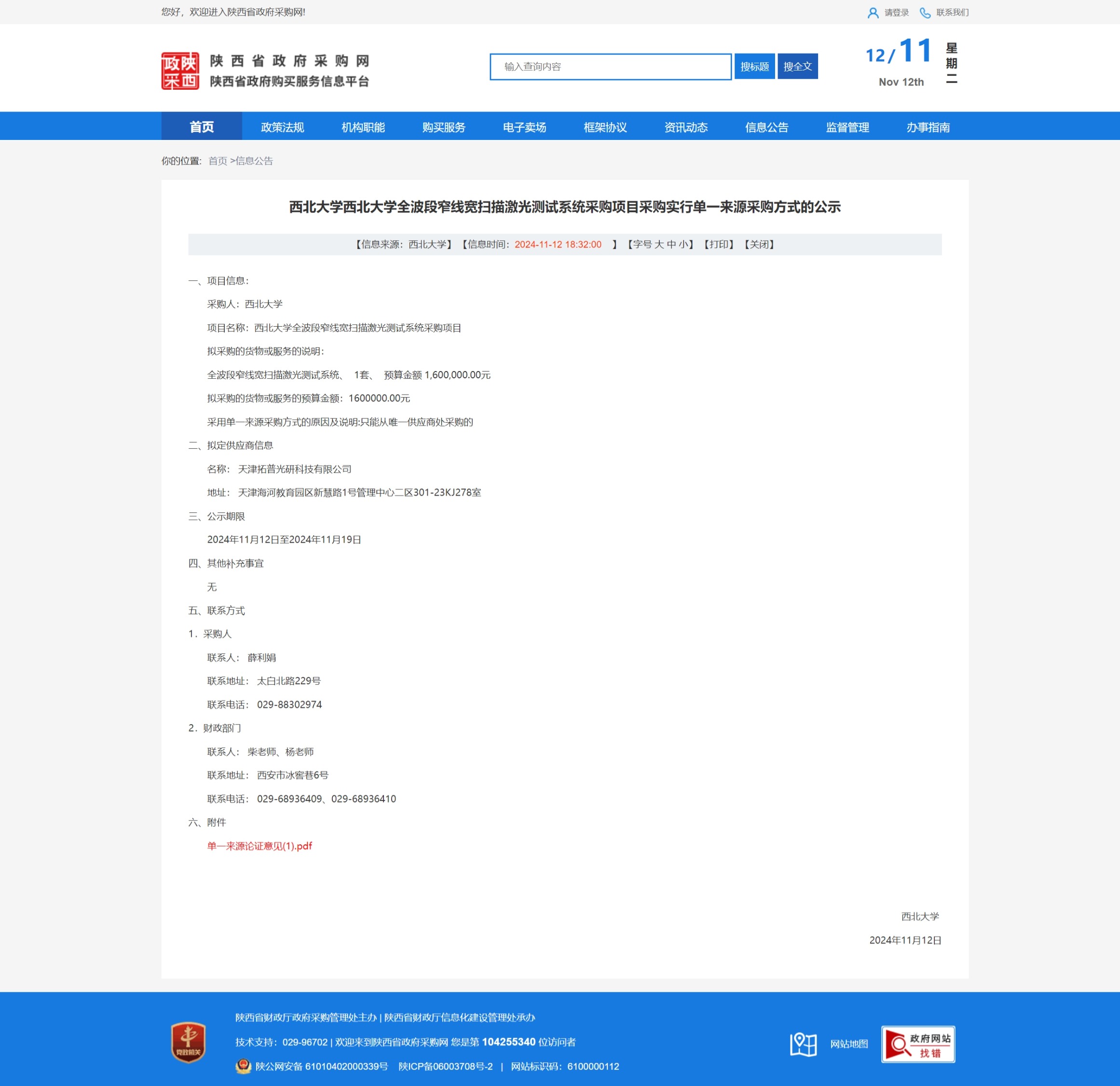乐投平台全波段窄线宽扫描激光测试系统采购项目采购实行单一来源采购方式的公示 作者: 编辑:薛利娟 时间:2024-11-12 原公告链接:https://www.ccgp-shaanxi.gov.cn/freecms/site/shaanxi/ggxx/info/2024/8a69c24d91d6105a01931fd0fd6f6828.html?noticeType=001051¬iceId=e9c41b14-a0e2-11ef-8063-08c0eb20c666