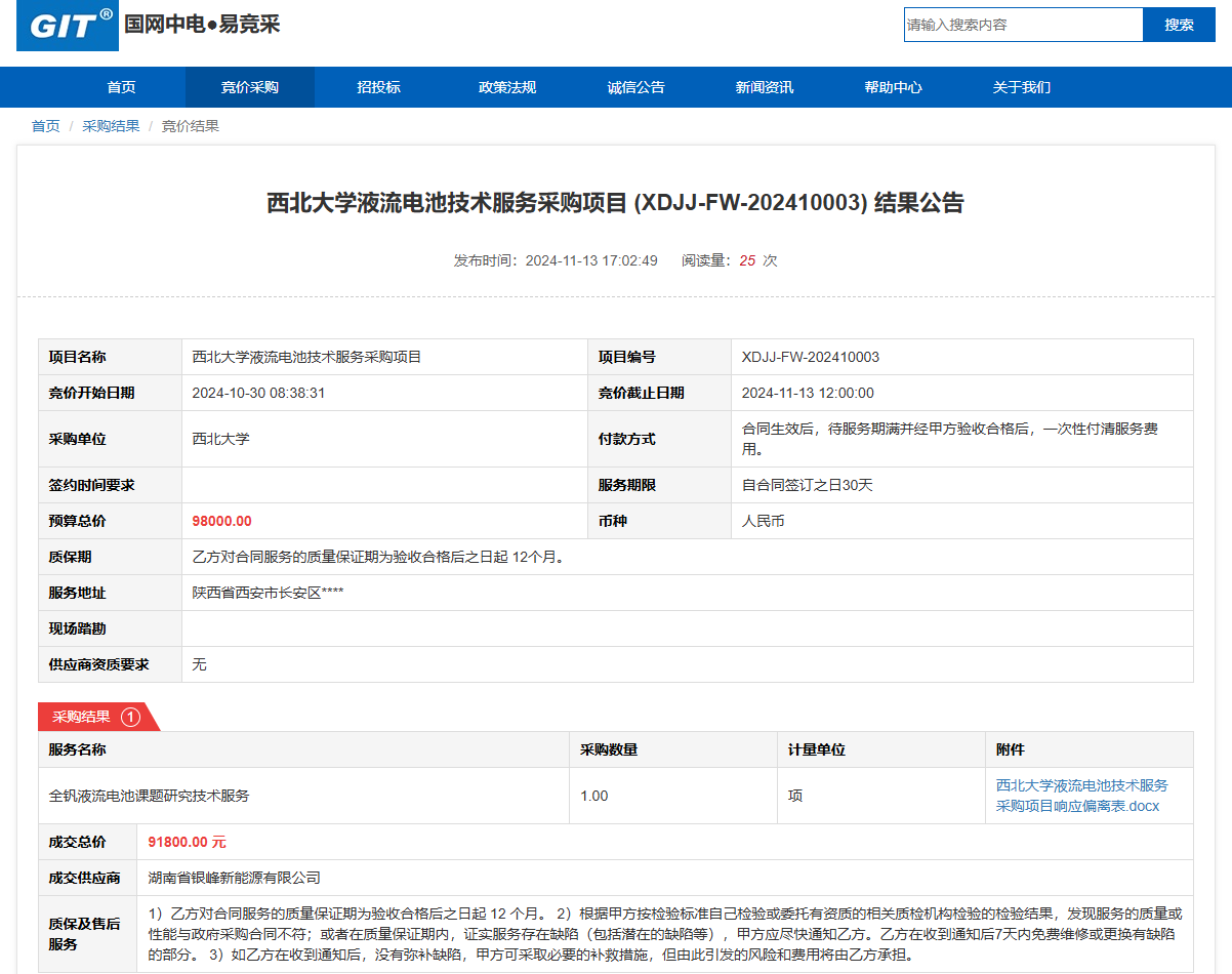 乐投平台液流电池技术服务采购项目(XDJJ-FW-202410003)竞价结果公告 作者:采购与招标办公室 编辑: 时间:2024-11-14 原公告链接:https://www.ejingcai.com.cn/site/bidding/detail/14829
