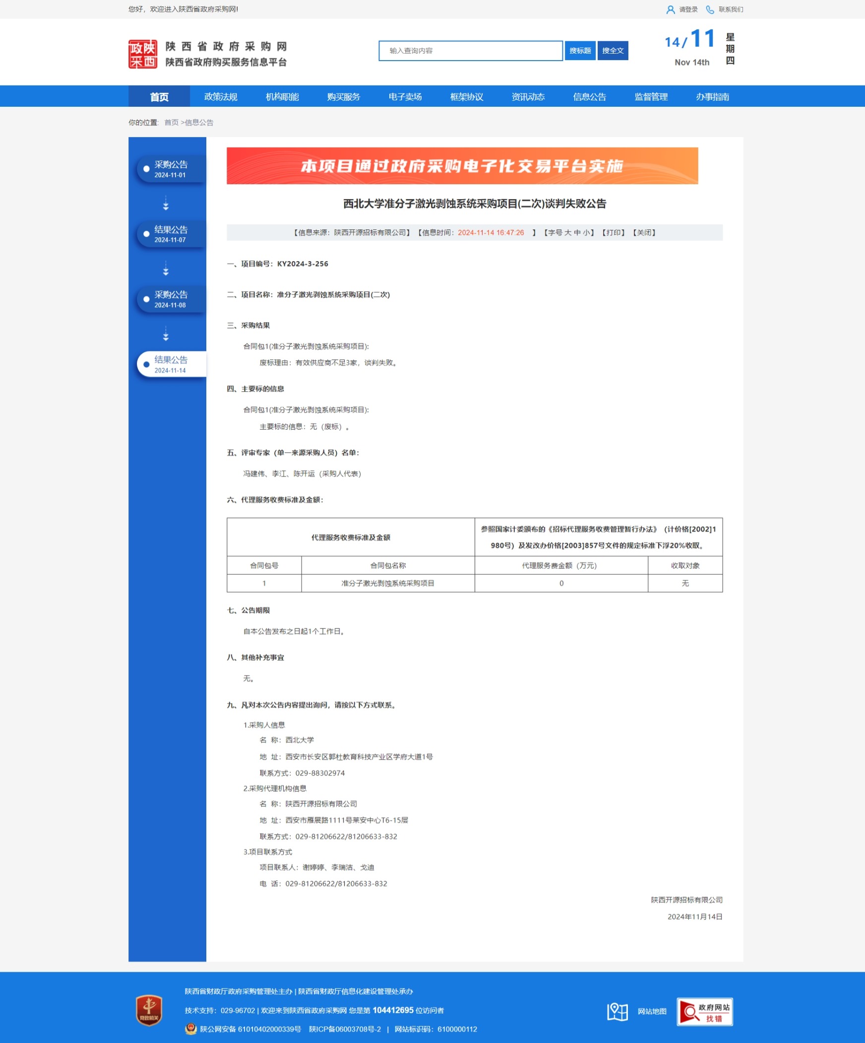 乐投平台准分子激光剥蚀系统采购项目(二次)谈判失败公告 作者: 编辑:薛利娟 时间:2024-11-14 原公告链接:https://www.ccgp-shaanxi.gov.cn/freecms/site/shaanxi/ggxx/info/2024/8a69c44e9218572b019329d196666b38.html?noticeType=001006¬iceId=a4a84f2c-a266-11ef-8063-08c0eb20c666