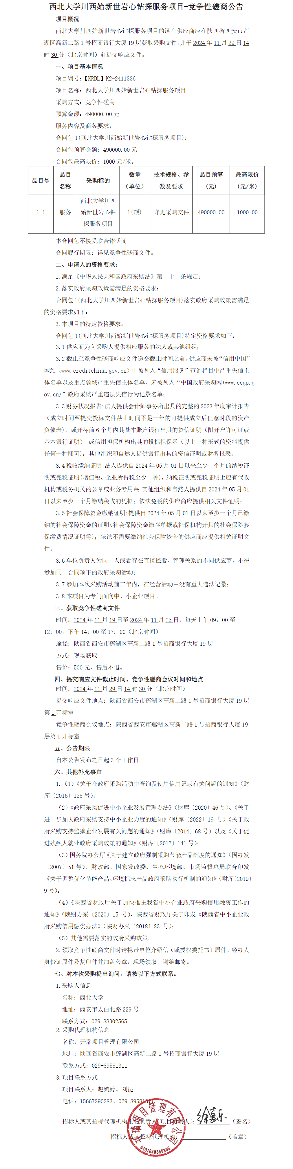乐投平台西安市古生物信息学重点实验室岩芯钻取服务项目竞争性磋商公告