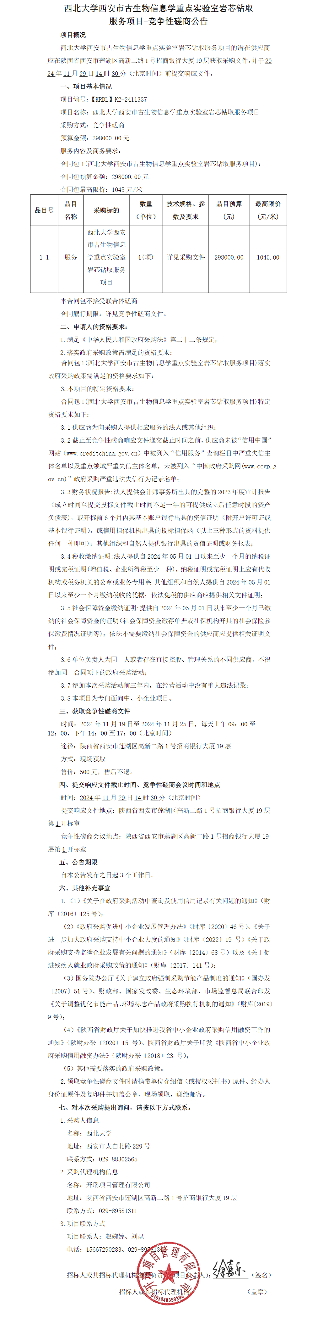 乐投平台西安市古生物信息学重点实验室岩芯钻取服务项目竞争性磋商公告