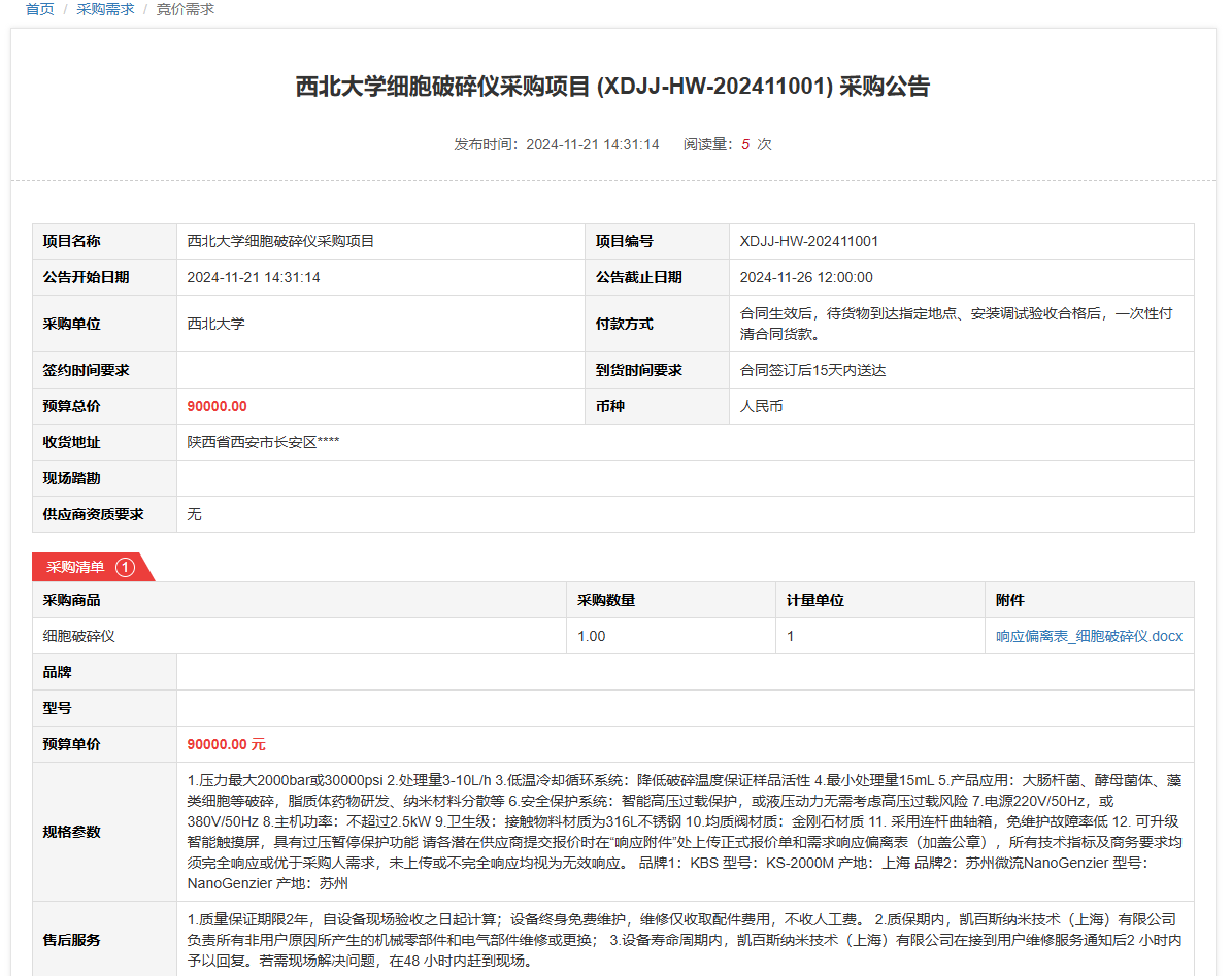 乐投平台细胞破碎仪采购项目(XDJJ-HW-202411001)竞价采购公告 作者:采购与招标办公室 编辑: 时间:2024-11-21 原公告链接:https://www.ejingcai.com.cn/site/bidding/detail/15200