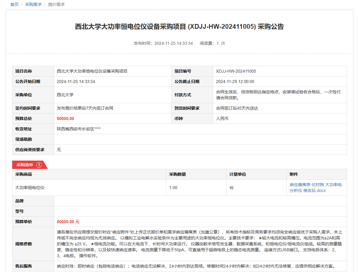 乐投平台大功率恒电位仪设备采购项目(XDJJ-HW-202411005)竞价采购公告 作者:采购与招标办公室 编辑: 时间:2024-11-25 原公告链接:https://www.ejingcai.com.cn/site/bidding/detail/15327