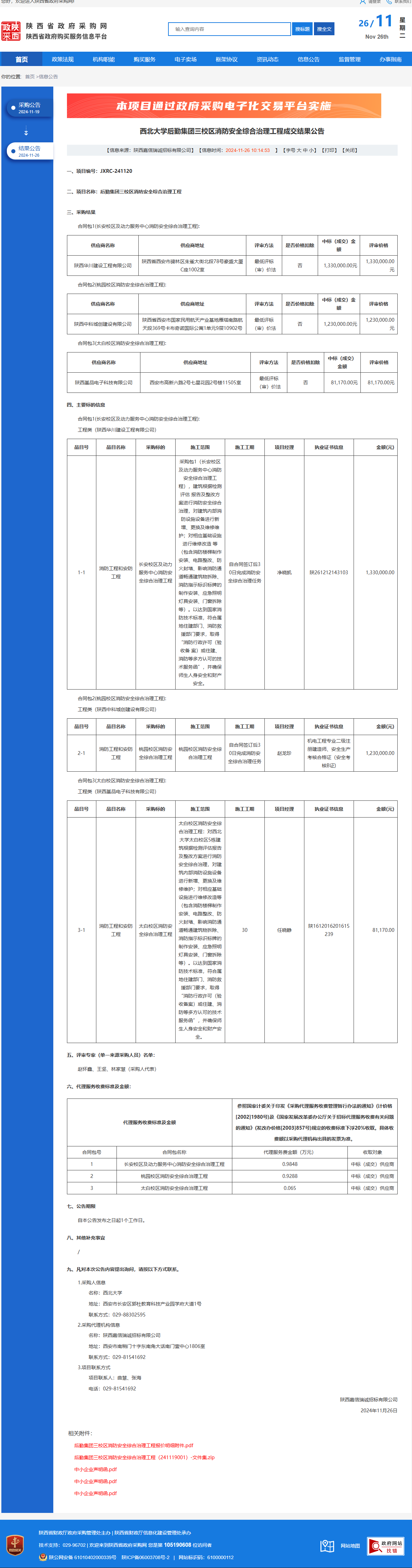 乐投平台后勤集团三校区消防安全综合治理工程成交结果公告