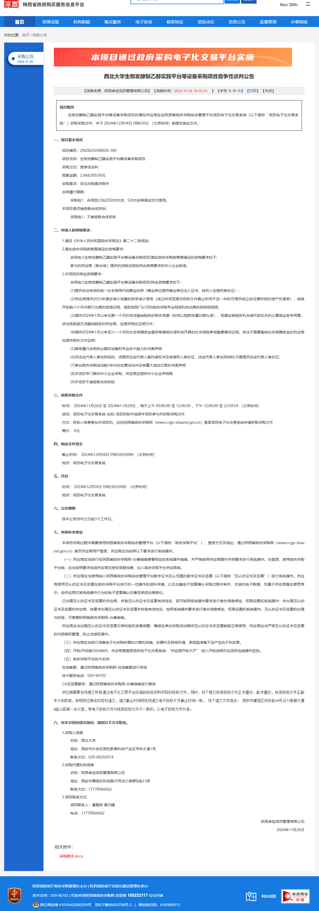 乐投平台生物发酵制乙醇实践平台等设备采购项目竞争性谈判公告 作者:采购与招标办公室 编辑: 时间:2024-11-26 原公告链接:https://www.ccgp-shaanxi.gov.cn/freecms/site/shaanxi/ggxx/info/2024/8a69c95d921859f0019365f6c5e47f67.html?noticeType=001013¬iceId=8a2ac2c3-abce-11ef-8063-08c0eb20c666