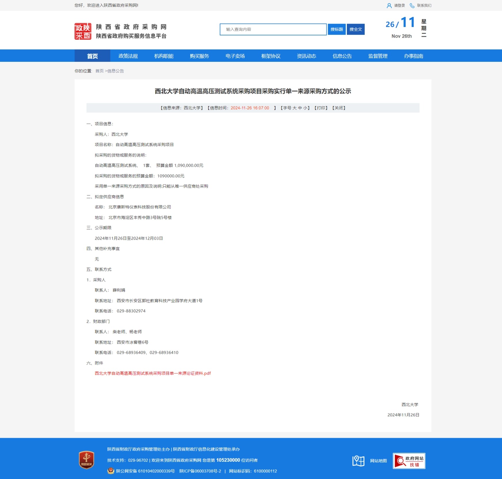 乐投平台自动高温高压测试系统采购项目采购实行单一来源采购方式的公示 作者: 编辑:薛利娟 时间:2024-11-26 原公告链接:https://www.ccgp-shaanxi.gov.cn/freecms/site/shaanxi/ggxx/info/2024/8a69c037936597080193677af75243c5.html?noticeType=001051¬iceId=008eb2b0-abcf-11ef-8063-08c0eb20c666