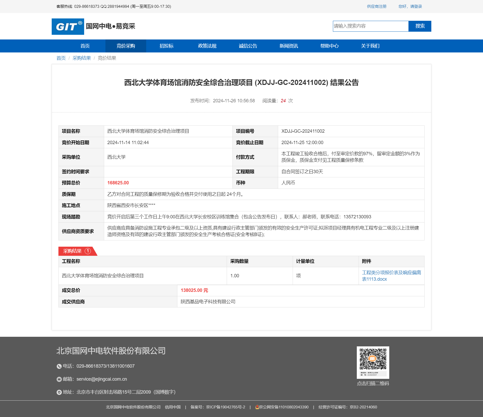 乐投平台体育场馆消防安全综合治理项目 (XDJJ-GC-202411002) 结果公告