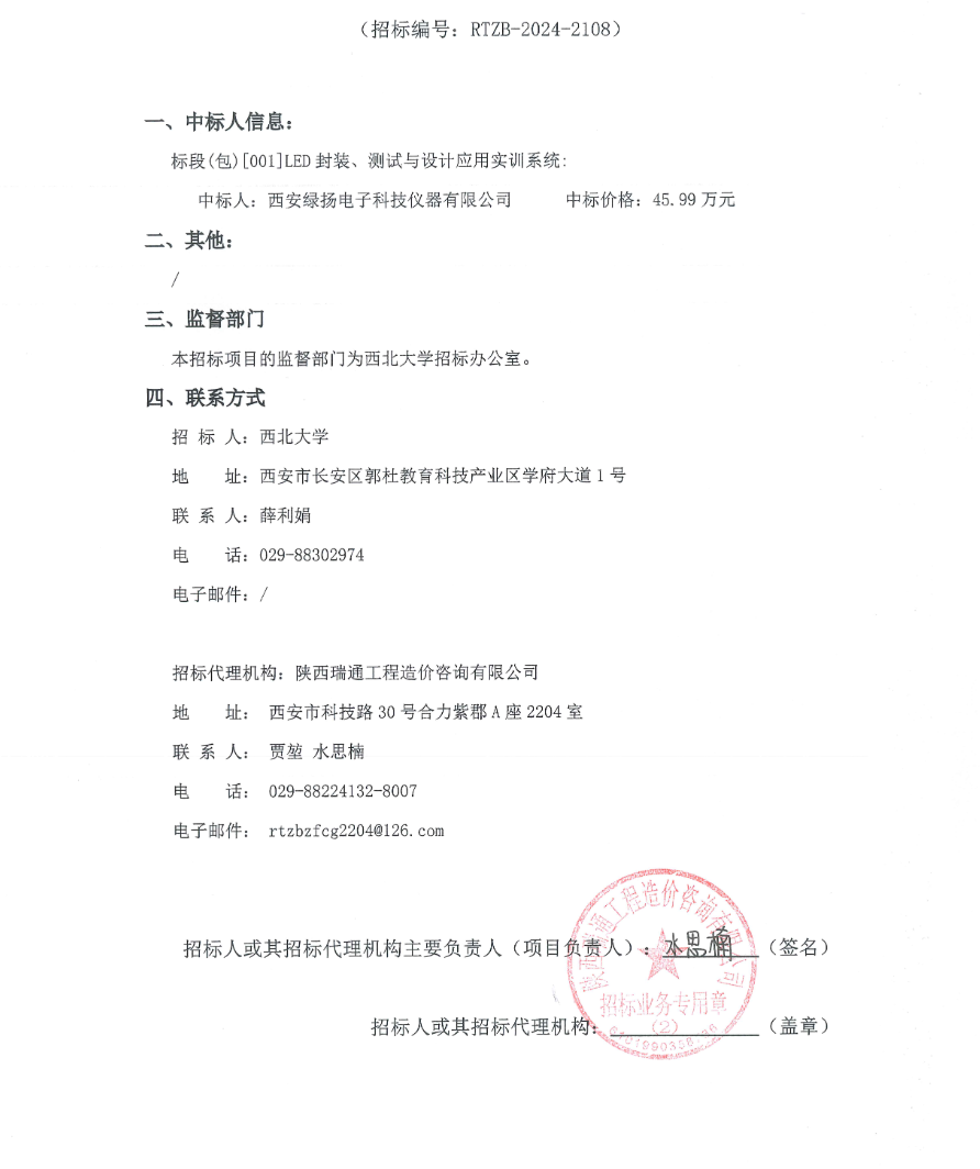 乐投平台LED封装、测试与设计应用实训系统采购项目成交结果公告 作者: 编辑:薛利娟 时间:2024-11-28 原公告链接:http://bulletin.sntba.com/resultBulletin/2024-11-28/1990146.html