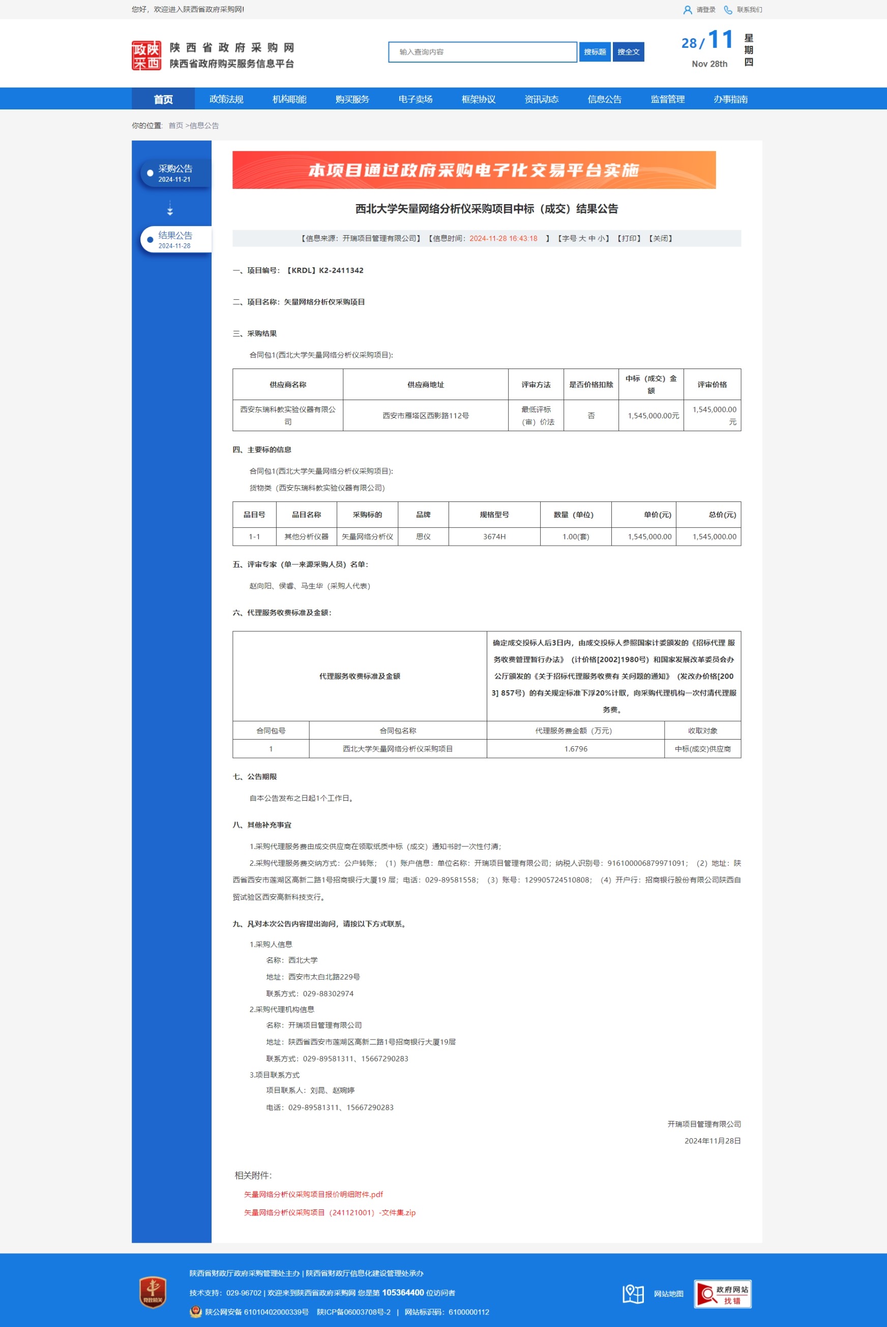 乐投平台矢量网络分析仪采购项目中标(成交)结果公告 作者: 编辑:薛利娟 时间:2024-11-28 原公告链接:https://www.ccgp-shaanxi.gov.cn/freecms/site/shaanxi/ggxx/info/2024/8a69c44e9218572b019371e2bf985e3c.html?noticeType=001023¬iceId=690e3458-ad66-11ef-8063-08c0eb20c666
