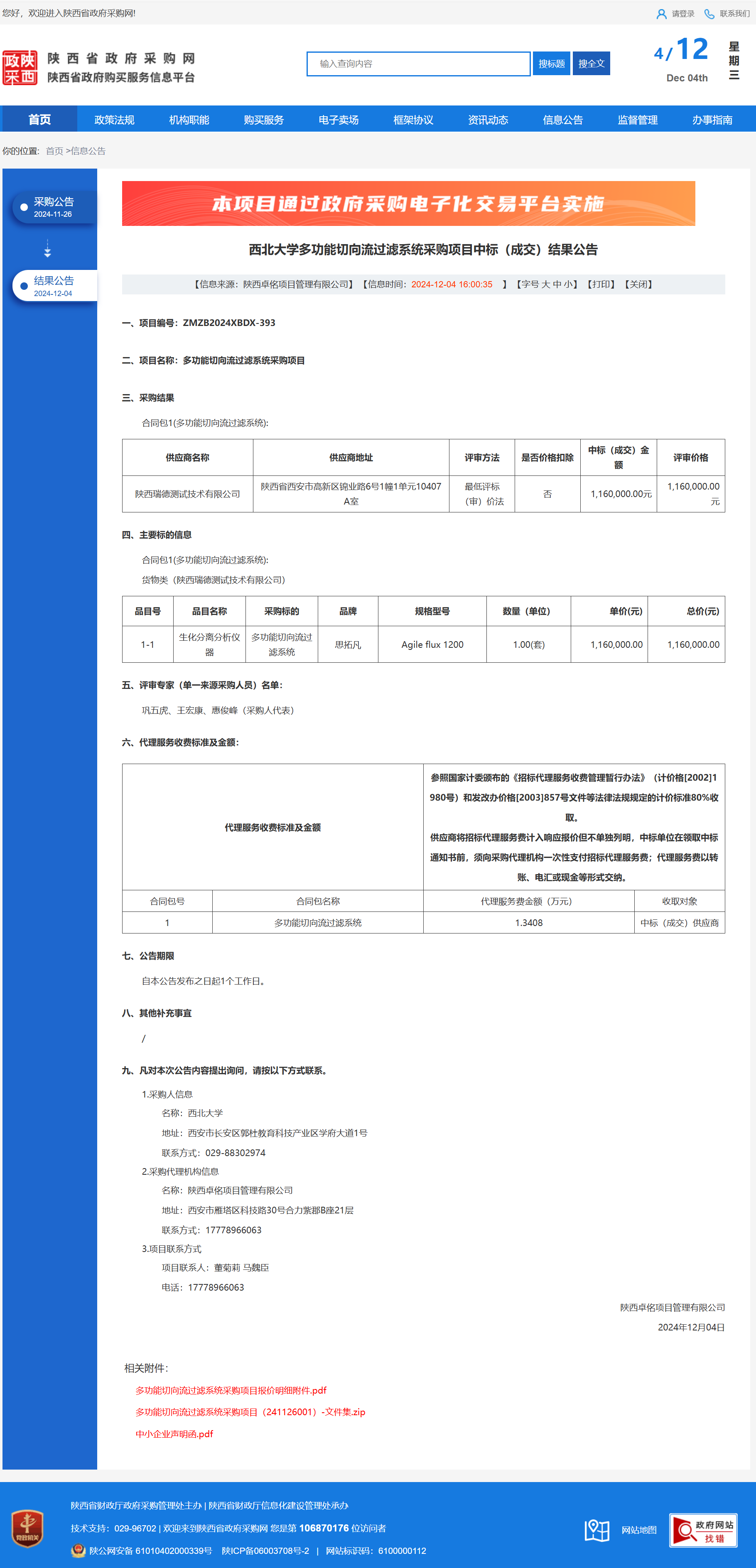 乐投平台多功能切向流过滤系统采购项目中标(成交)结果公告 作者:采购与招标办公室 编辑: 时间:2024-12-04 原公告链接:https://www.ccgp-shaanxi.gov.cn/freecms/site/shaanxi/ggxx/info/2024/8a69c251921857370193906a95e723a6.html?noticeType=001023¬iceId=72dcd5e1-b217-11ef-8063-08c0eb20c666