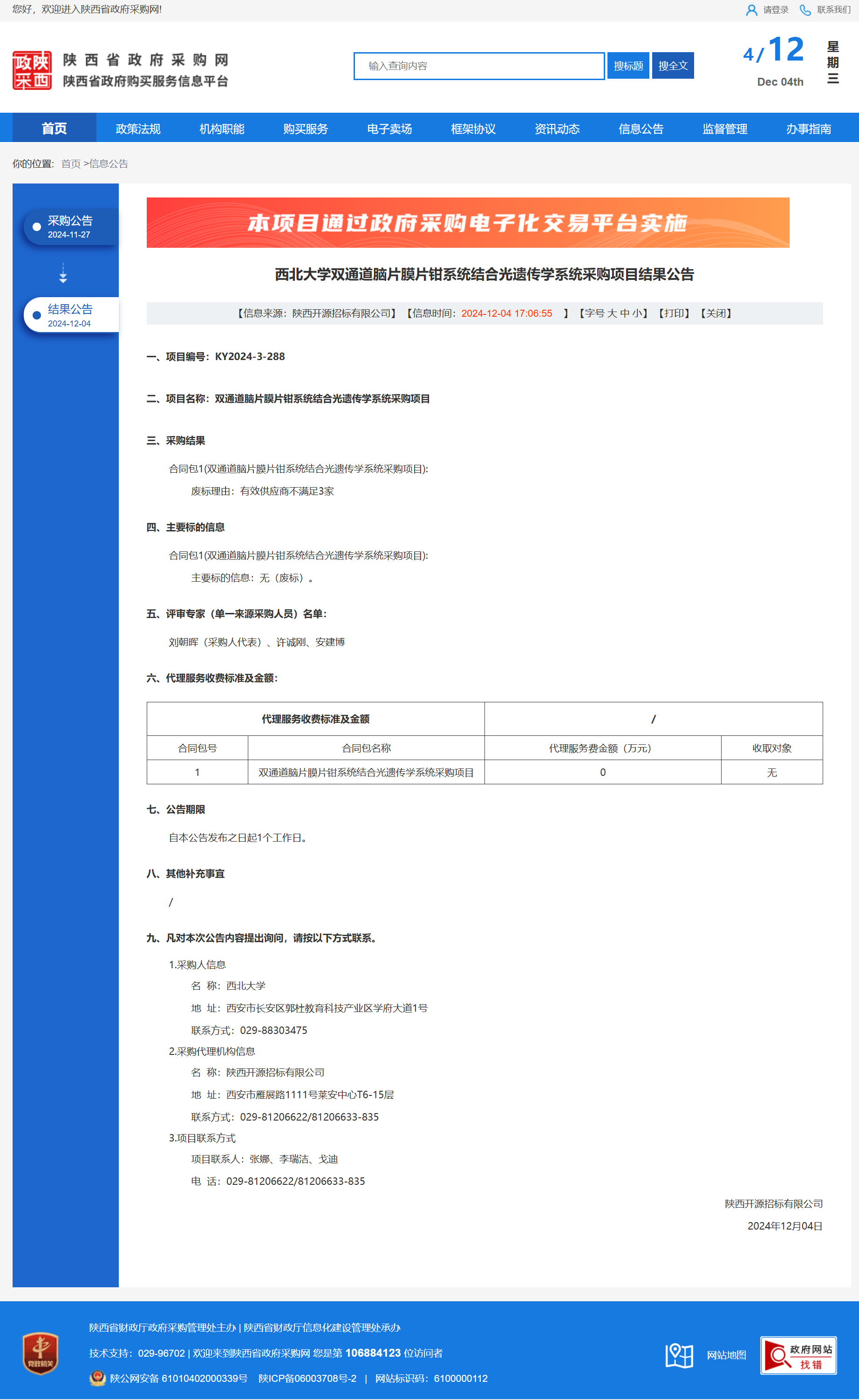 乐投平台双通道脑片膜片钳系统结合光遗传学系统采购项目结果公告 作者:采购与招标办公室 编辑: 时间:2024-12-04 原公告链接:https://www.ccgp-shaanxi.gov.cn/freecms/site/shaanxi/ggxx/info/2024/8a69c95d921859f0019390e7940533eb.html?noticeType=001006¬iceId=b68a3b19-b220-11ef-8063-08c0eb20c666