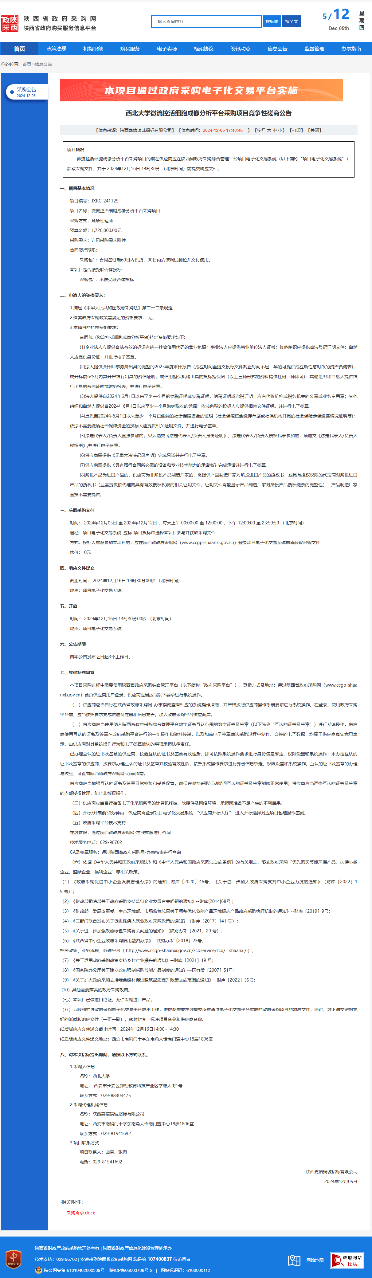 乐投平台微流控活细胞成像分析平台采购项目竞争性磋商公告 作者:采购与招标办公室 编辑: 时间:2024-12-05 原公告链接:https://www.ccgp-shaanxi.gov.cn/freecms/site/shaanxi/ggxx/info/2024/8a69c5a59218576d0193962b8b5f7d27.html?noticeType=001016¬iceId=ba5283be-b2ef-11ef-8063-08c0eb20c666
