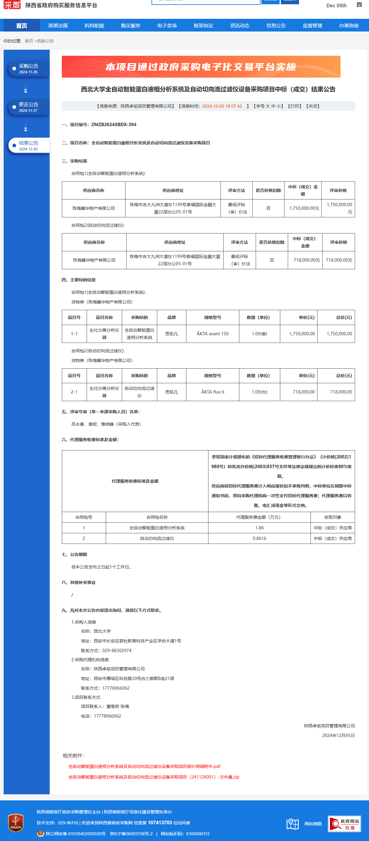 乐投平台全自动智能蛋白液相分析系统及自动切向流过滤仪设备采购项目中标(成交)结果公告 作者:采购与招标办公室 编辑: 时间:2024-12-05 原公告链接:https://www.ccgp-shaanxi.gov.cn/freecms/site/shaanxi/ggxx/info/2024/8a69c44e9218572b01939643fffe267c.html?noticeType=001023¬iceId=5fe3fe15-b2f2-11ef-8063-08c0eb20c666