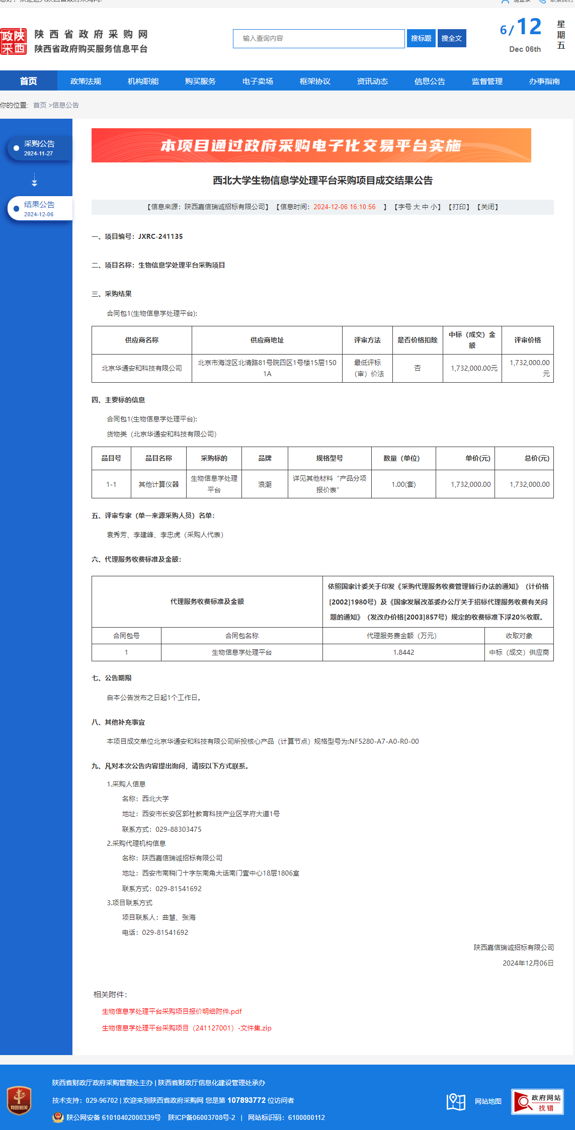 乐投平台生物信息学处理平台采购项目成交结果公告 作者:采购与招标办公室 编辑: 时间:2024-12-06 原公告链接:https://www.ccgp-shaanxi.gov.cn/freecms/site/shaanxi/ggxx/info/2024/8a69c5a59218576d01939ab2d6091195.html?noticeType=001023¬iceId=3a640688-b3ab-11ef-8063-08c0eb20c666