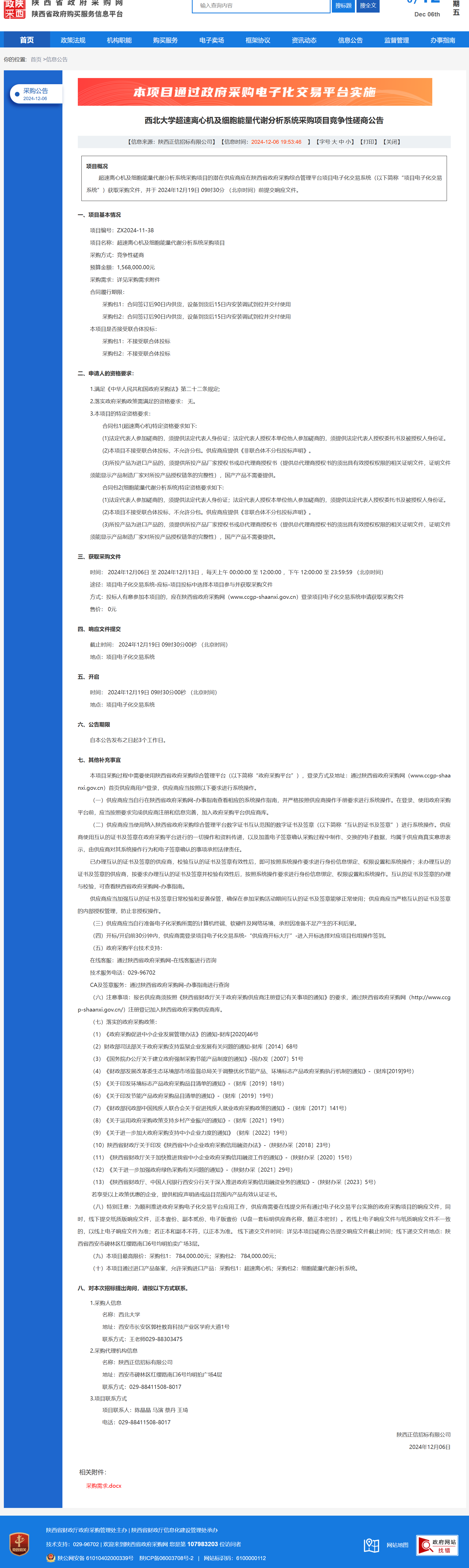 乐投平台超速离心机及细胞能量代谢分析系统采购项目竞争性磋商公告 作者:采购与招标办公室 编辑: 时间:2024-12-06 原公告链接:https://www.ccgp-shaanxi.gov.cn/freecms/site/shaanxi/ggxx/info/2024/8a69c5a59218576d01939bb6350f3f92.html?noticeType=001016¬iceId=5be8bcca-b3ca-11ef-8063-08c0eb20c666