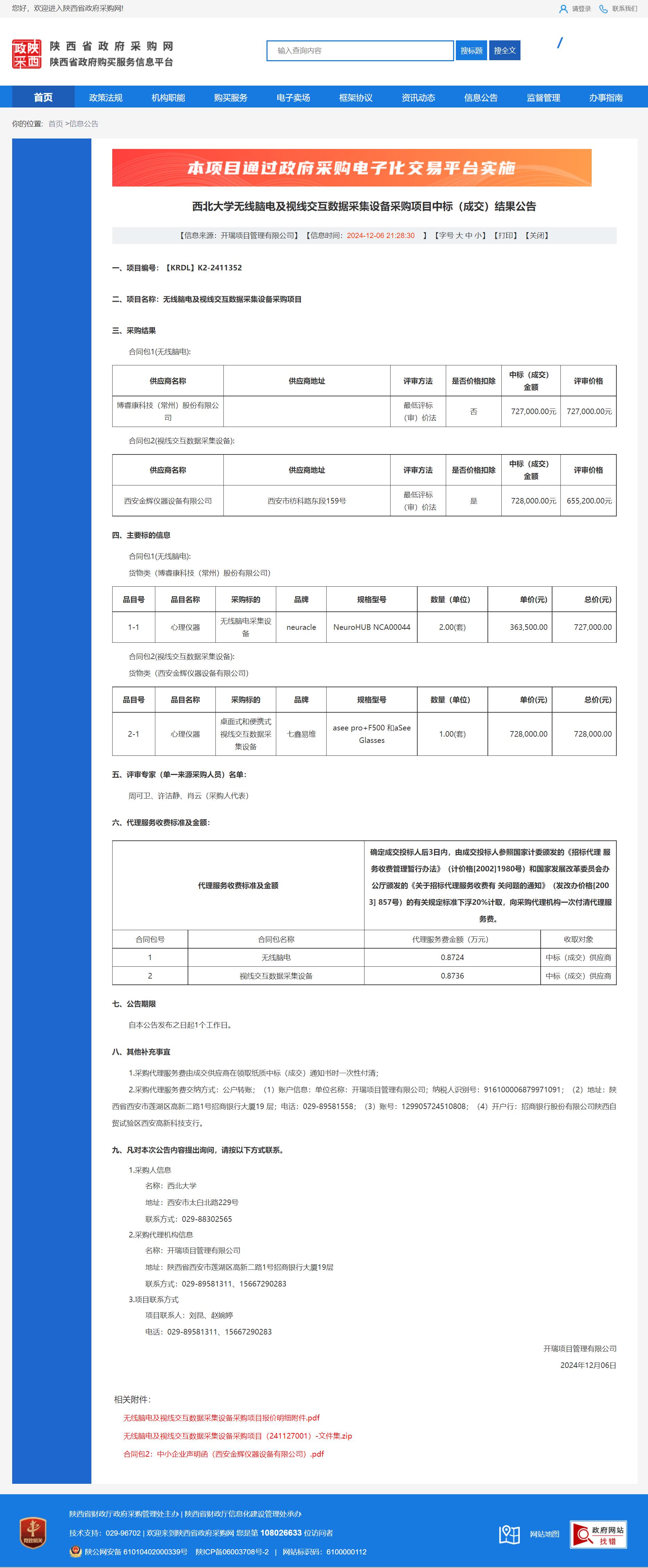 乐投平台无线脑电及视线交互数据采集设备采购项目中标(成交)结果公告