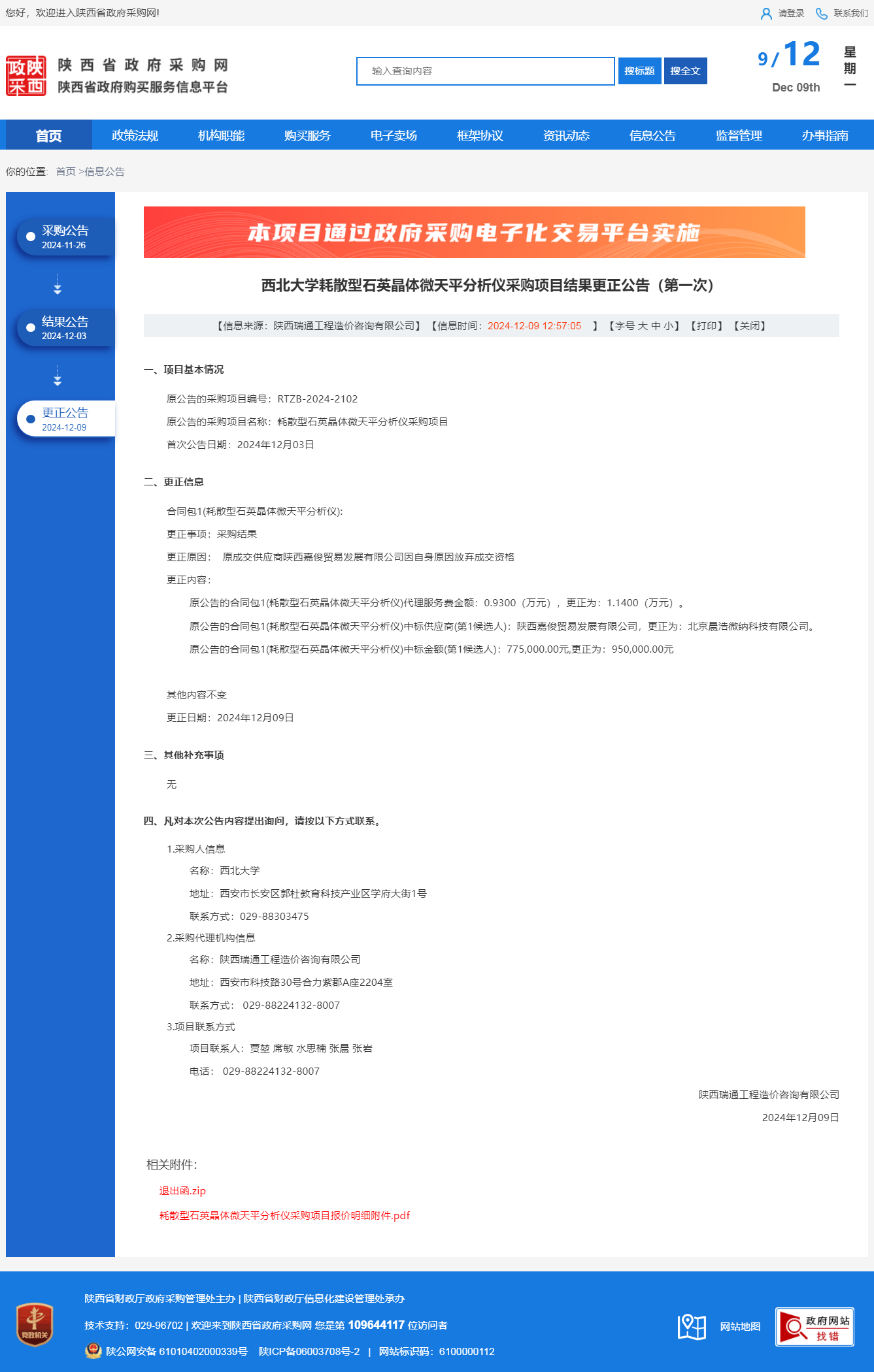 乐投平台耗散型石英晶体微天平分析仪采购项目结果更正公告(第一次) 作者:采购与招标办公室 编辑: 时间:2024-12-09 原公告链接:http://www.ccgp-shaanxi.gov.cn/freecms/site/shaanxi/ggxx/info/2024/8a69c251921857370193a9a220bd255f.html?noticeType=001032¬iceId=a663ae52-b5eb-11ef-8063-08c0eb20c666