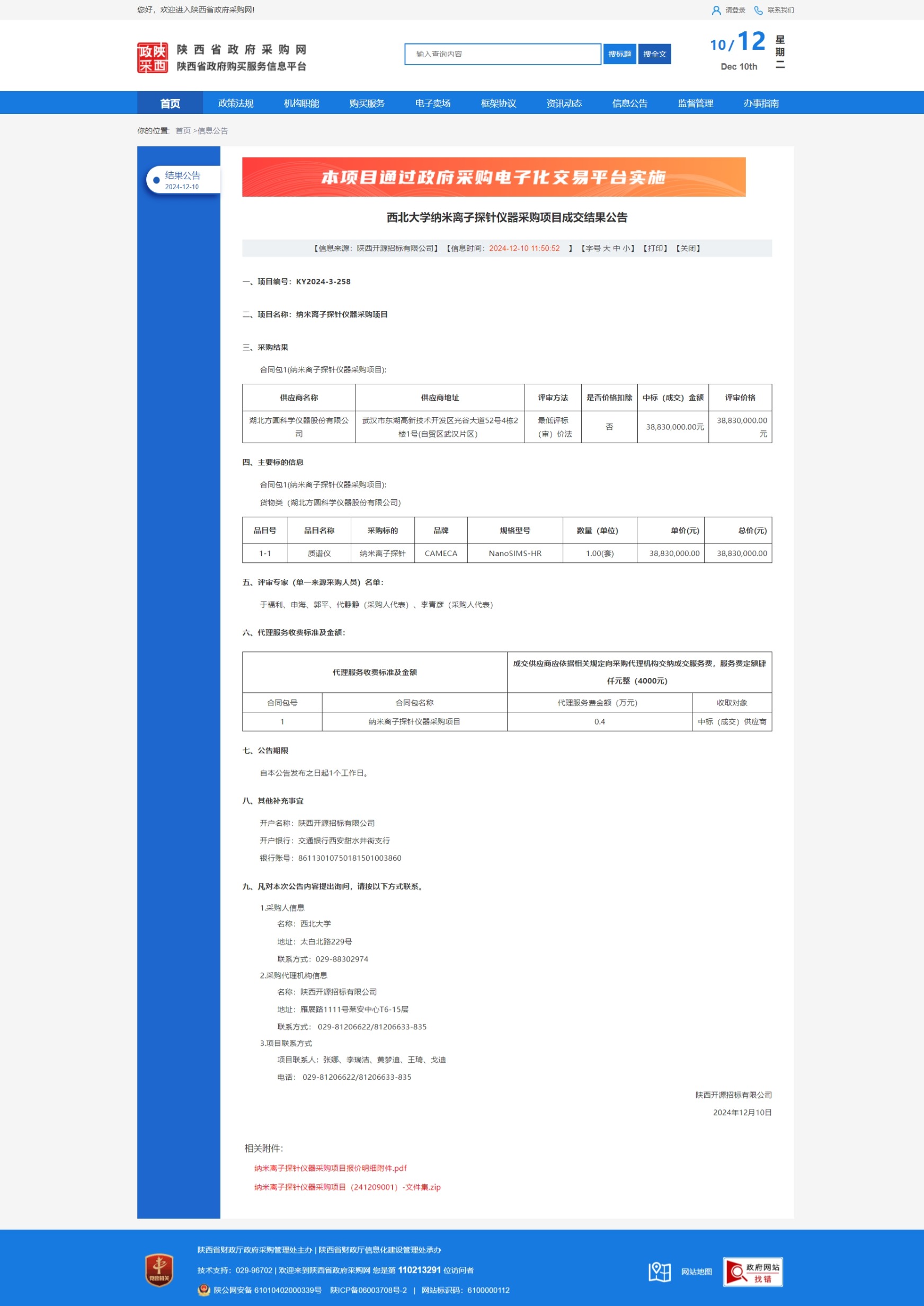 乐投平台纳米离子探针仪器采购项目成交结果公告 作者: 编辑:薛利娟 时间:2024-12-10 原公告链接:https://www.ccgp-shaanxi.gov.cn/freecms/site/shaanxi/ggxx/info/2024/8a69c5a59218576d0193aea3717402eb.html?noticeType=001025¬iceId=917c05e9-b6ab-11ef-8063-08c0eb20c666