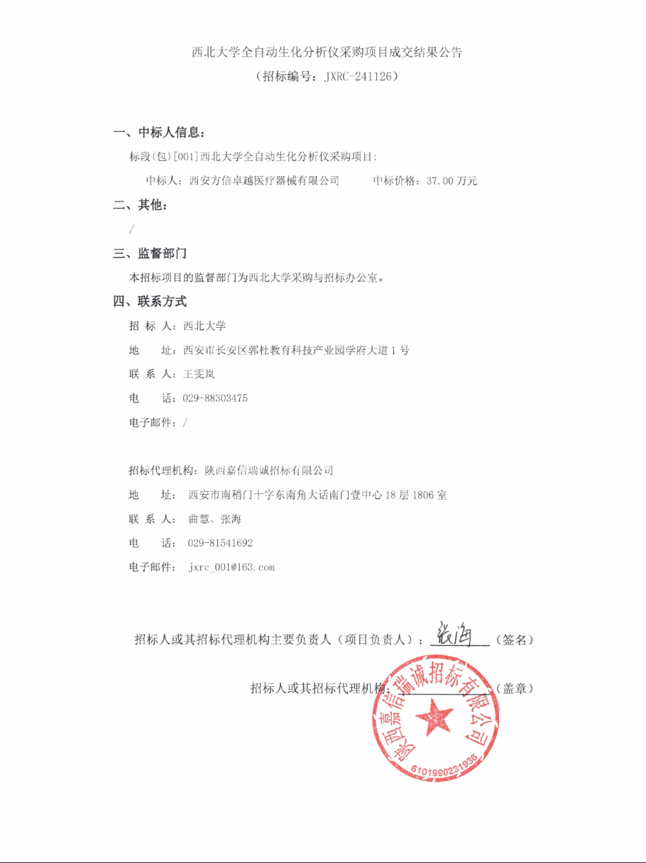 乐投平台全自动生化分析仪采购项目成交结果公告 作者:采购与招标办公室 编辑: 时间:2024-12-10 原公告链接:http://bulletin.sntba.com/resultBulletin/2024-12-10/1995691.html