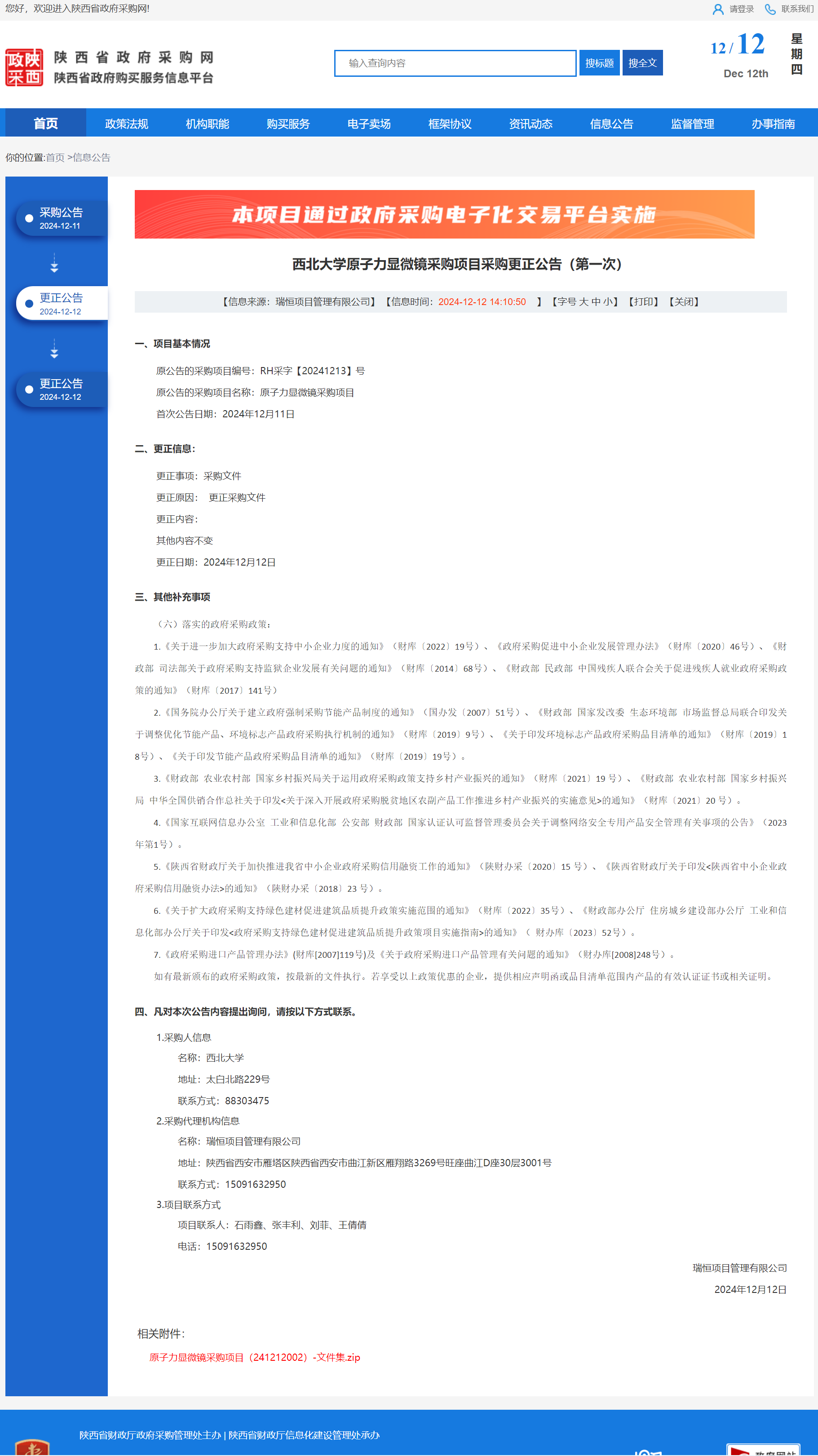 乐投平台原子力显微镜采购项目采购更正公告(第一次) 作者:采购与招标办公室 编辑: 时间:2024-12-12 原公告链接:https://www.ccgp-shaanxi.gov.cn/freecms/site/shaanxi/ggxx/info/2024/8a69c5a59218576d0193ba3c419e1460.html?noticeType=001031¬iceId=bbffc791-b86e-11ef-8063-08c0eb20c666