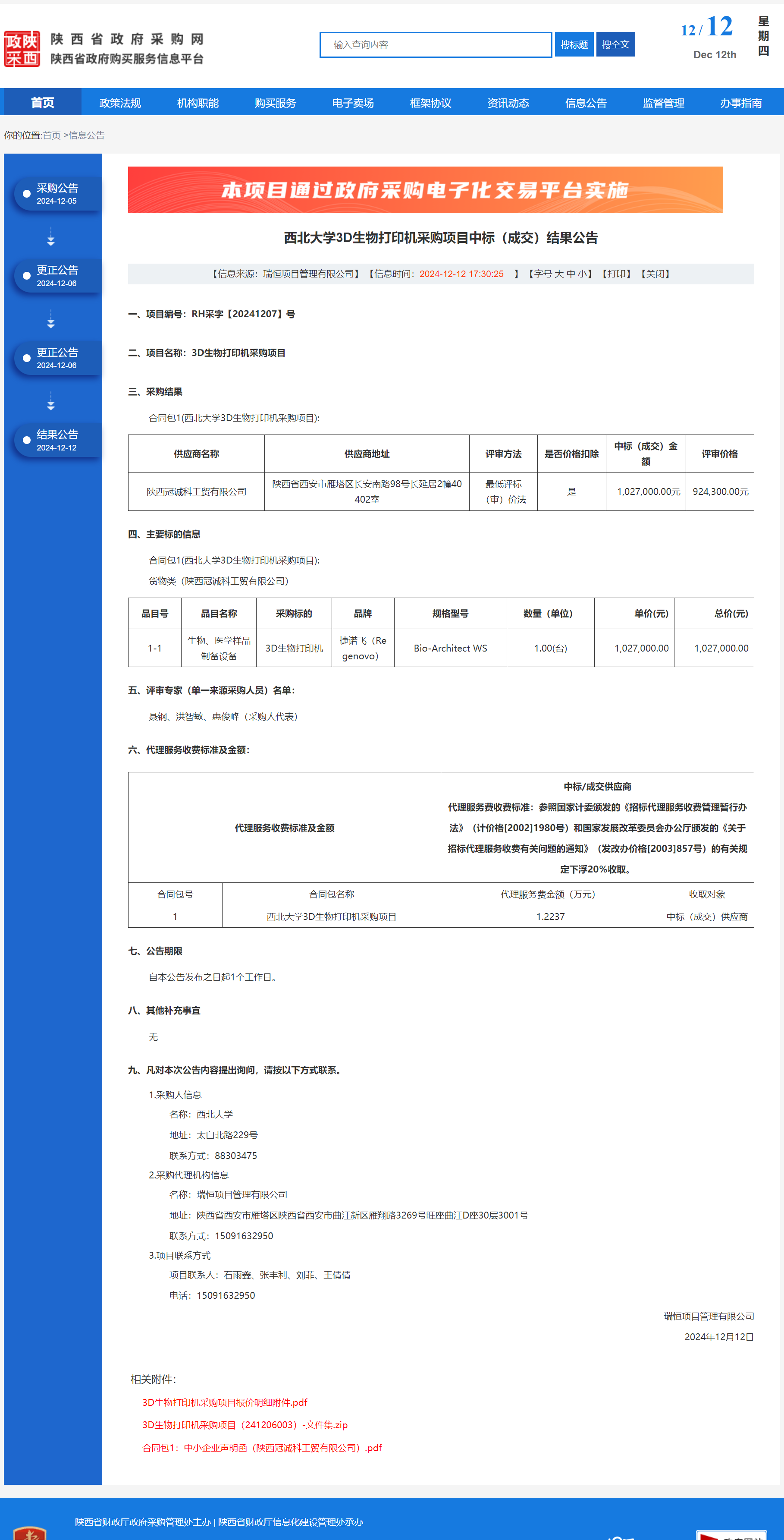 乐投平台3D生物打印机采购项目中标(成交)结果公告 作者:采购与招标办公室 编辑: 时间:2024-12-12 原公告链接:https://www.ccgp-shaanxi.gov.cn/freecms/site/shaanxi/ggxx/info/2024/8a69c95d921859f00193ba2d4fab4cb1.html