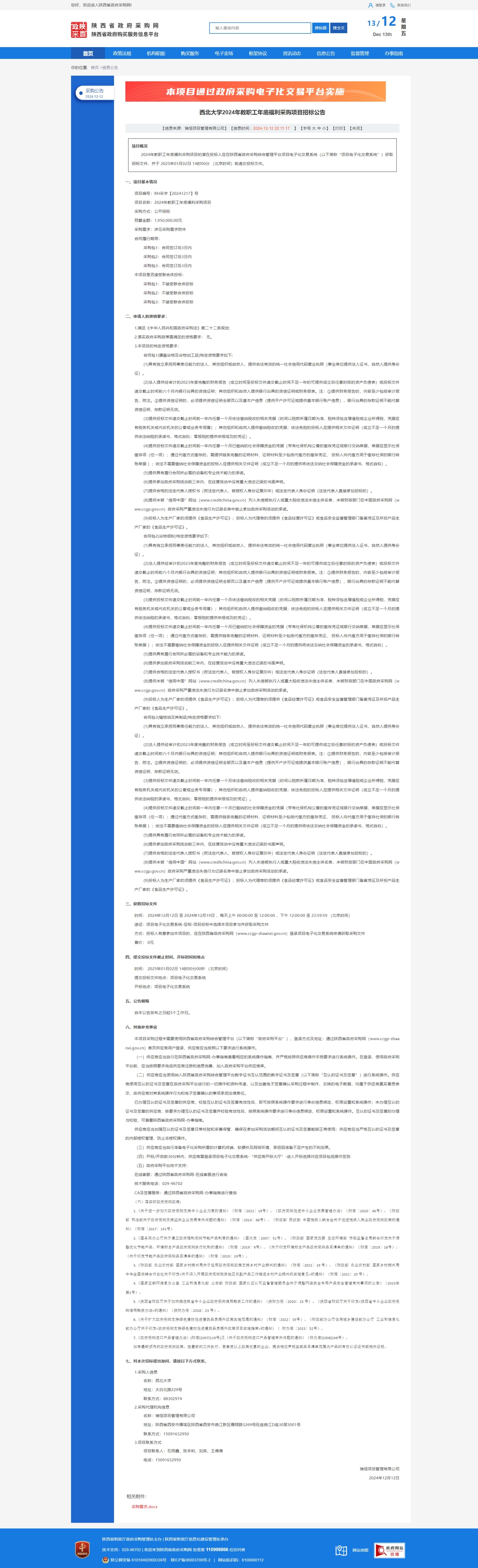 乐投平台2024年教职工年底福利采购项目招标公告 作者: 编辑:薛利娟 时间:2024-12-13 原公告链接:https://www.ccgp-shaanxi.gov.cn/freecms/site/shaanxi/ggxx/info/2024/8a69c95d921859f00193bb31dd1c2271.html?noticeType=001011¬iceId=937683d0-b894-11ef-8063-08c0eb20c666