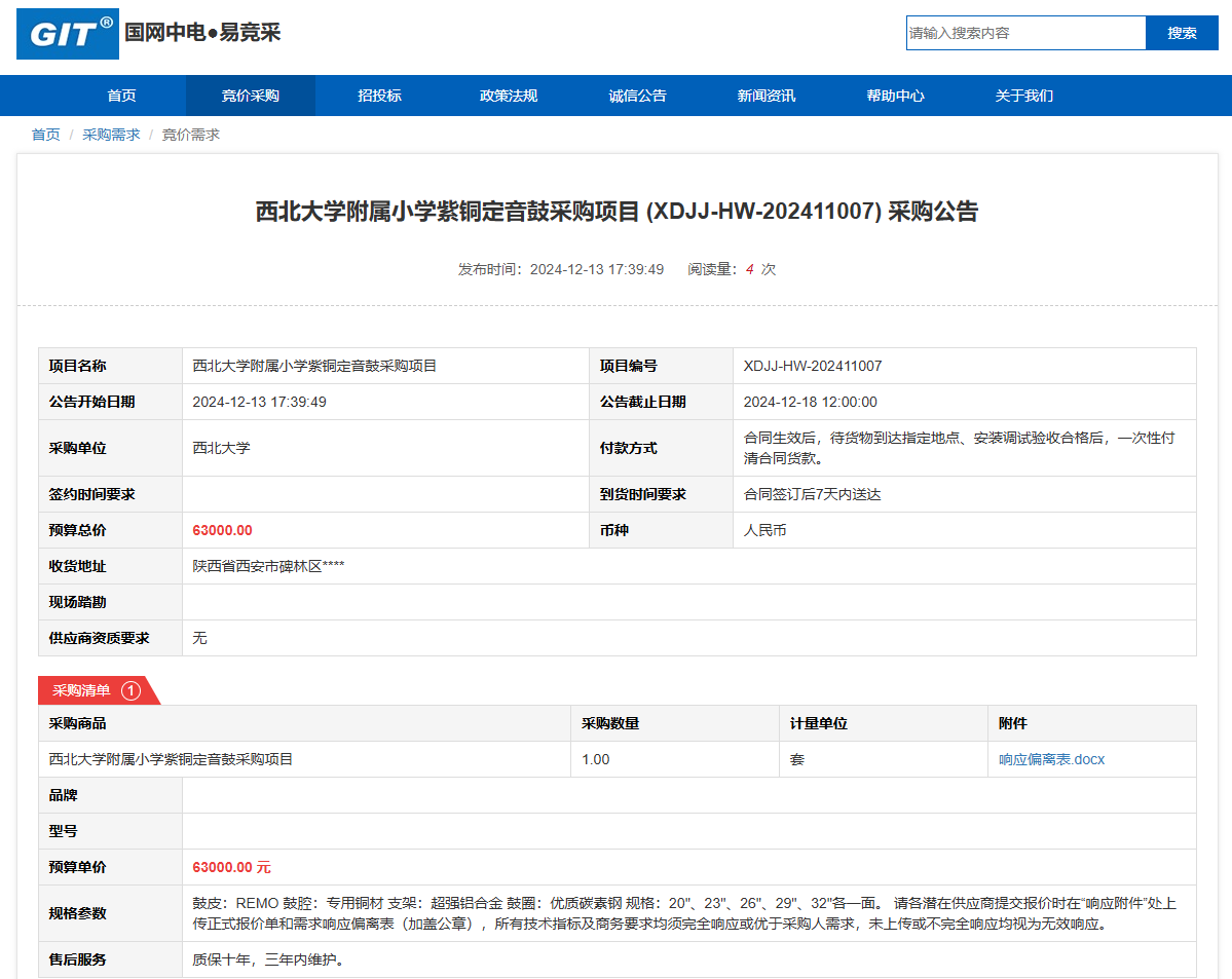 乐投平台附属小学紫铜定音鼓采购项目(XDJJ-HW-202411007)竞价采购公告 作者:采购与招标办公室 编辑: 时间:2024-12-13 原公告链接:https://www.ejingcai.com.cn/site/bidding/detail/15969