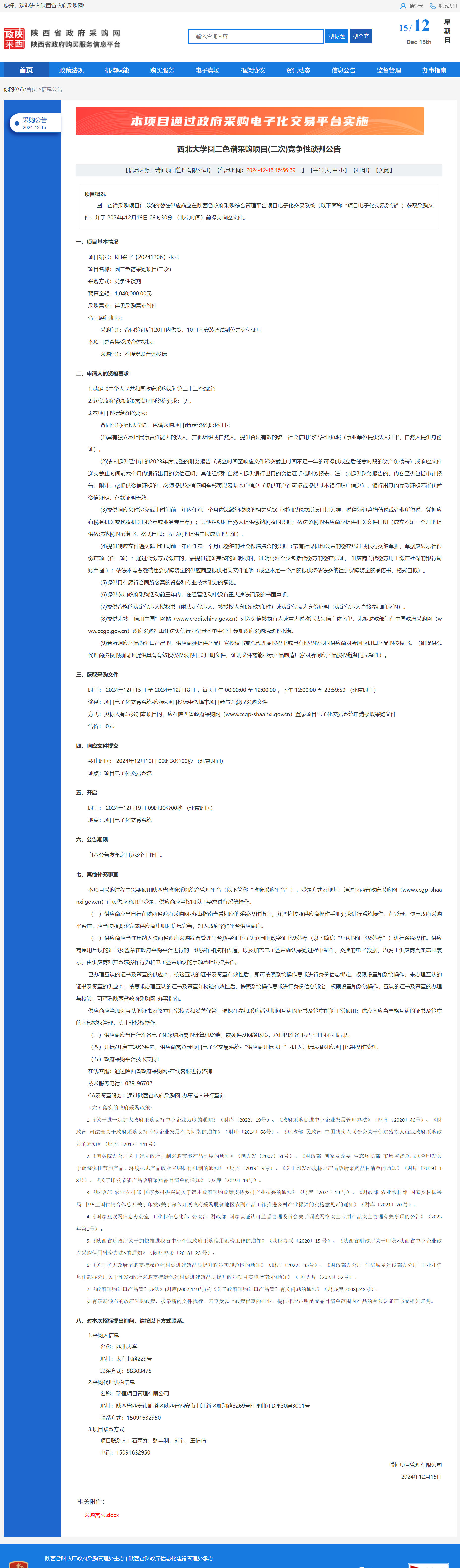 乐投平台圆二色谱采购项目(二次)竞争性谈判公告 作者:采购与招标办公室 编辑: 时间:2024-12-15 原公告链接:https://www.ccgp-shaanxi.gov.cn/freecms/site/shaanxi/ggxx/info/2024/8a69c44e9218572b0193c94ad4d5586c.html?noticeType=001013¬iceId=bf74a89c-babb-11ef-8063-08c0eb20c666