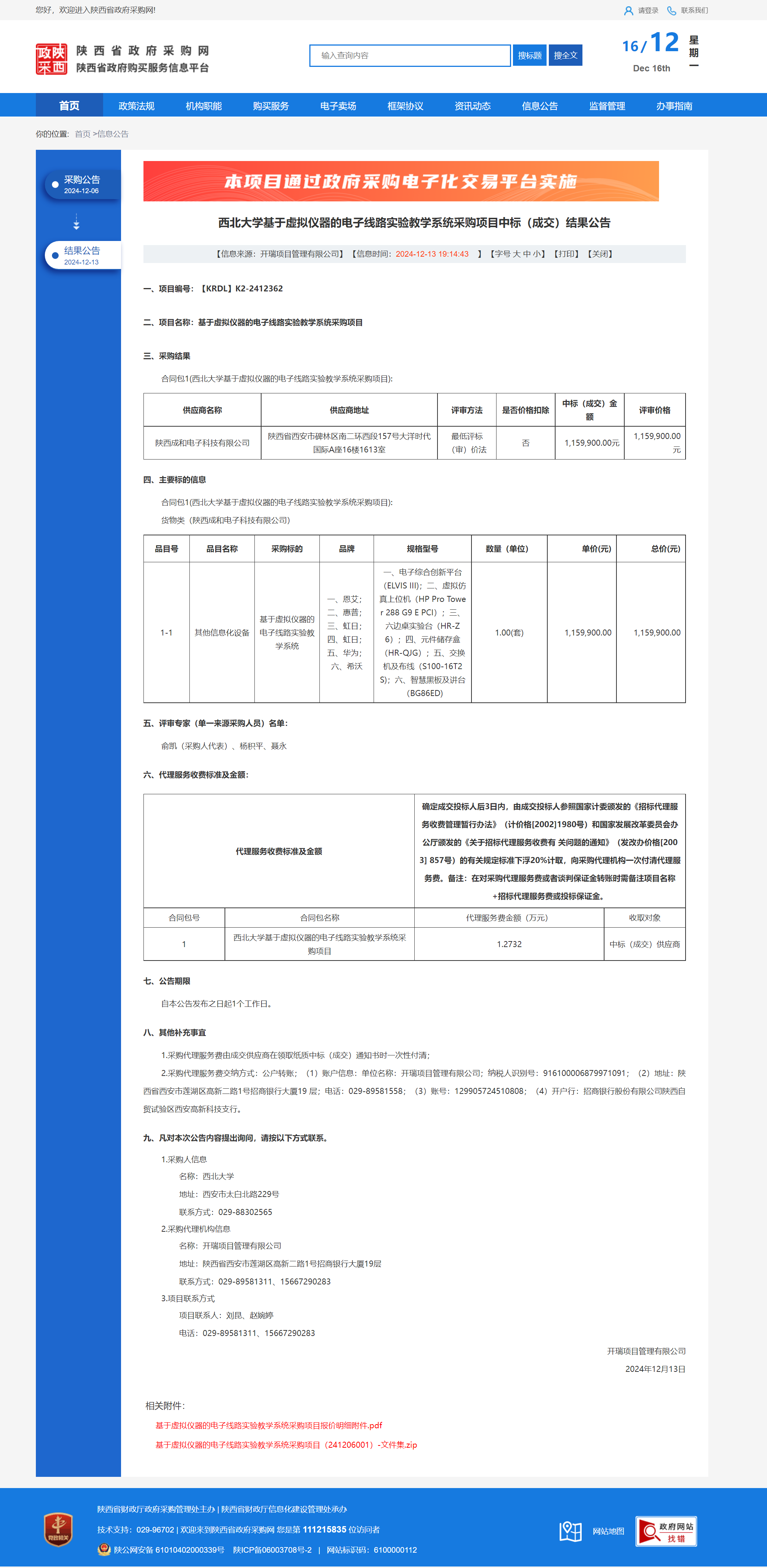 乐投平台基于虚拟仪器的电子线路实验教学系统采购项目中标(成交)结果公告