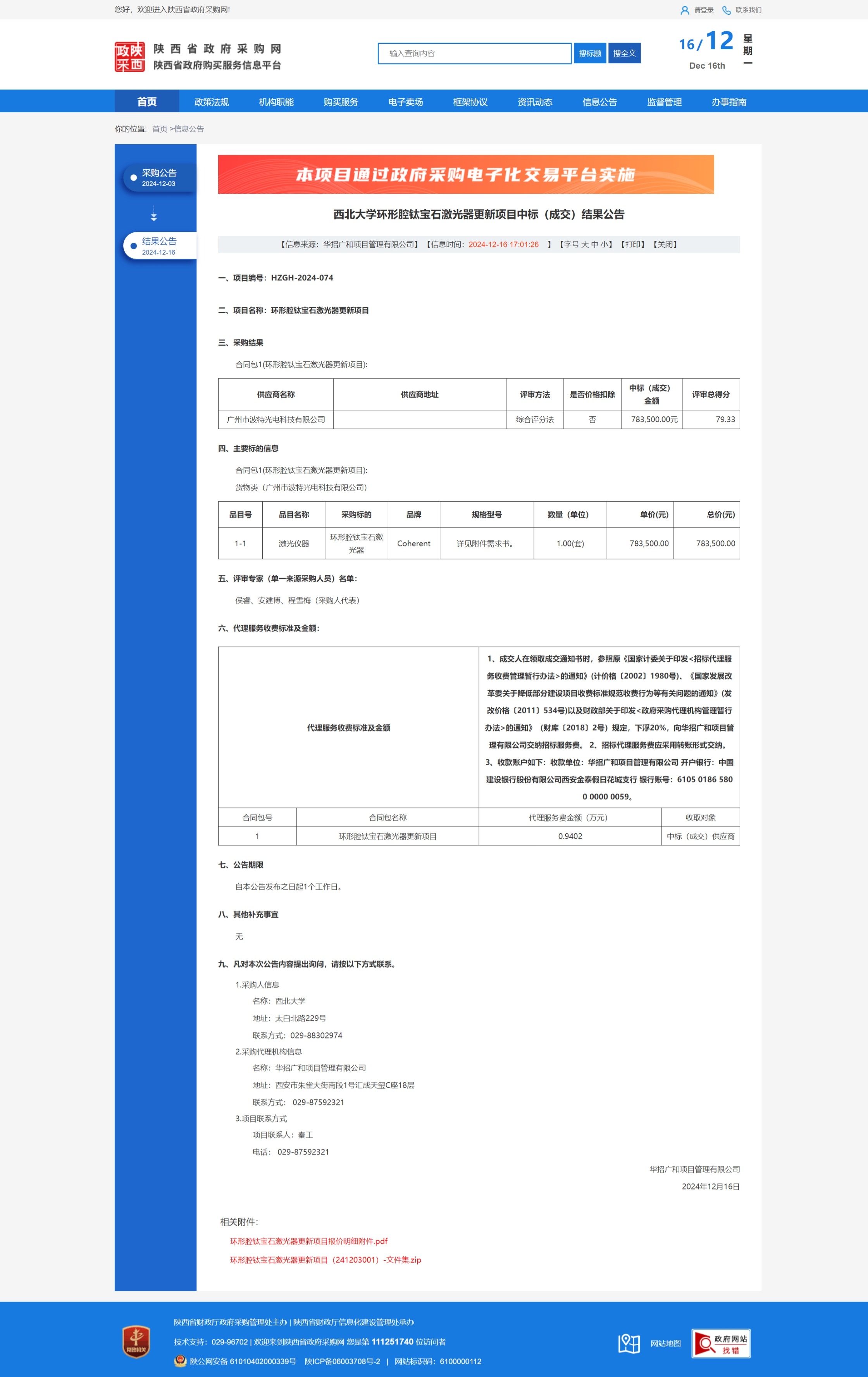 乐投平台环形腔钛宝石激光器更新项目中标(成交)结果公告 作者: 编辑:薛利娟 时间:2024-12-16 原公告链接:https://www.ccgp-shaanxi.gov.cn/freecms/site/shaanxi/ggxx/info/2024/8a69c5a59218576d0193ce0287994ccc.html?noticeType=001026¬iceId=f55ffa4f-bb8d-11ef-8063-08c0eb20c666