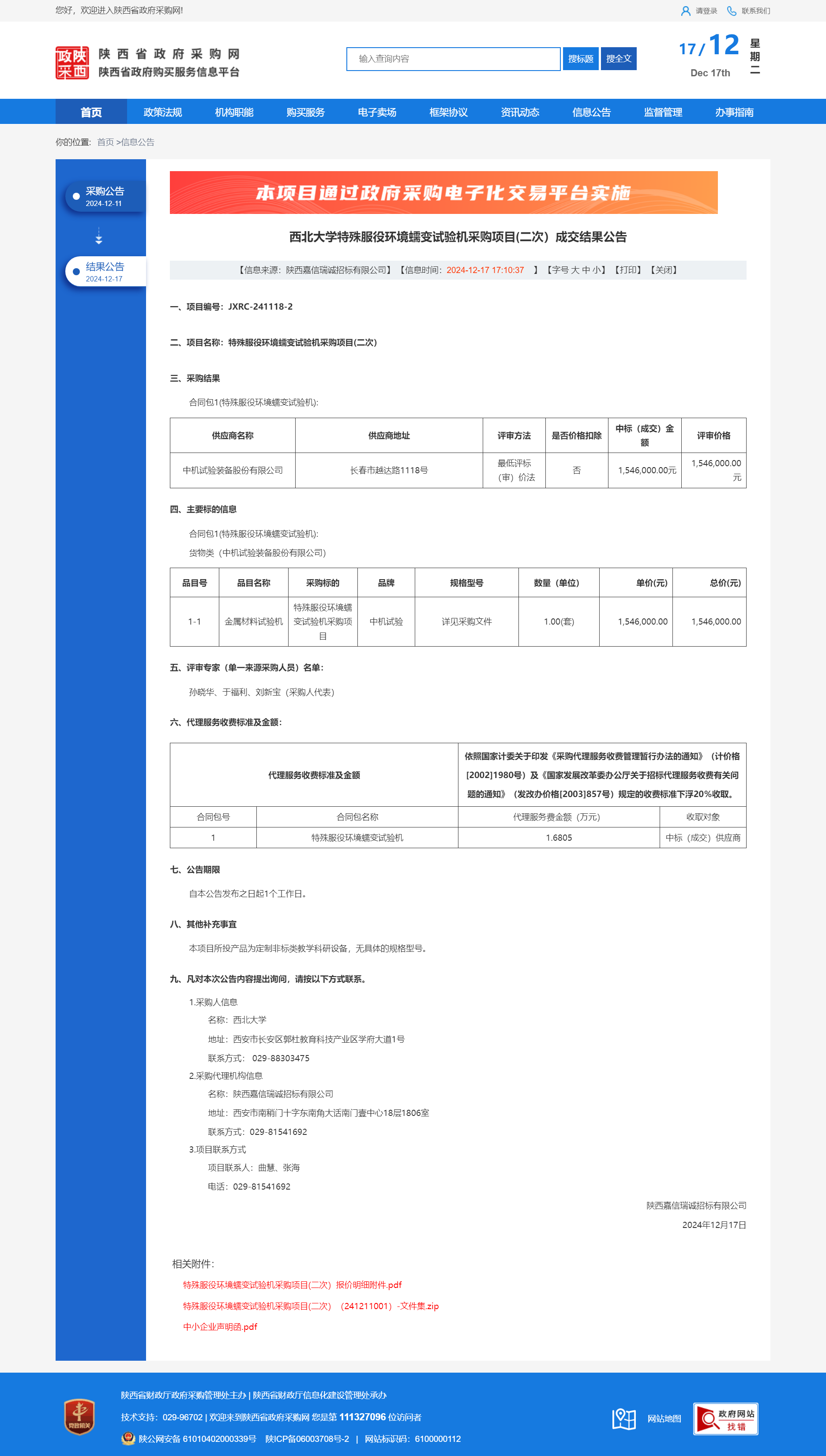 乐投平台特殊服役环境蠕变试验机采购项目(二次)成交结果公告 作者:采购与招标办公室 编辑: 时间:2024-12-17 原公告链接:https://www.ccgp-shaanxi.gov.cn/freecms/site/shaanxi/ggxx/info/2024/8a69c251921857370193d3cba5716502.html?noticeType=001023¬iceId=69320abb-bc58-11ef-8063-08c0eb20c666