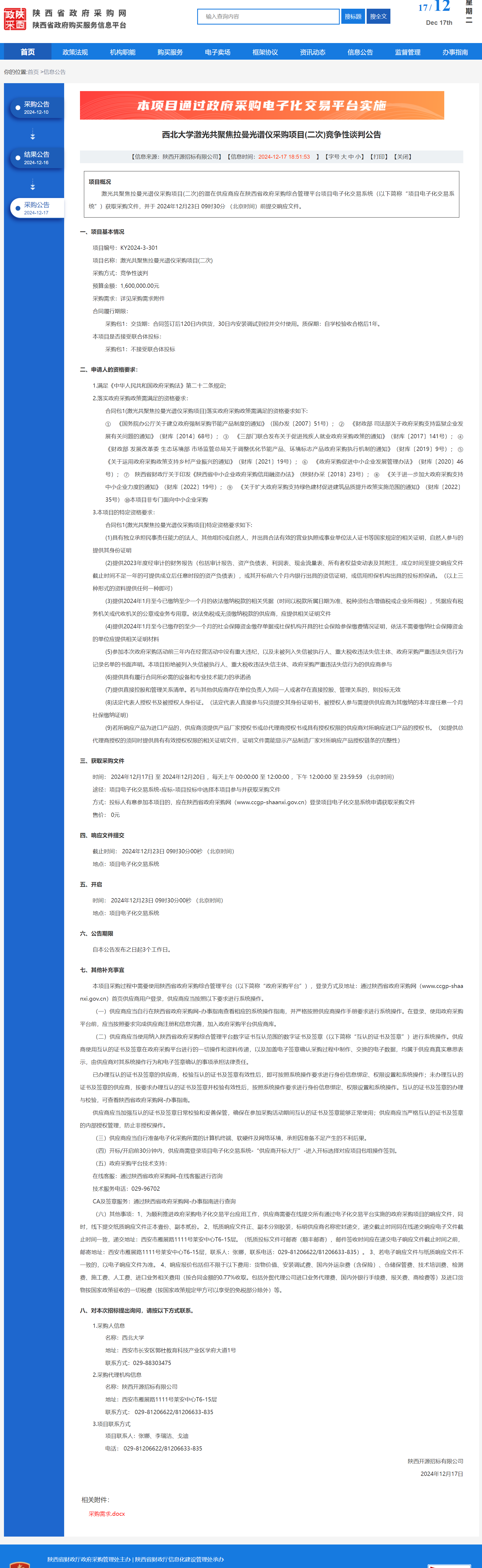 乐投平台激光共聚焦拉曼光谱仪采购项目(二次)竞争性谈判公告 作者:采购与招标办公室 编辑: 时间:2024-12-17 原公告链接:https://www.ccgp-shaanxi.gov.cn/freecms/site/shaanxi/ggxx/info/2024/8a69c44e9218572b0193d434f6c730a9.html?noticeType=001013¬iceId=8ed4237e-bc66-11ef-8063-08c0eb20c666