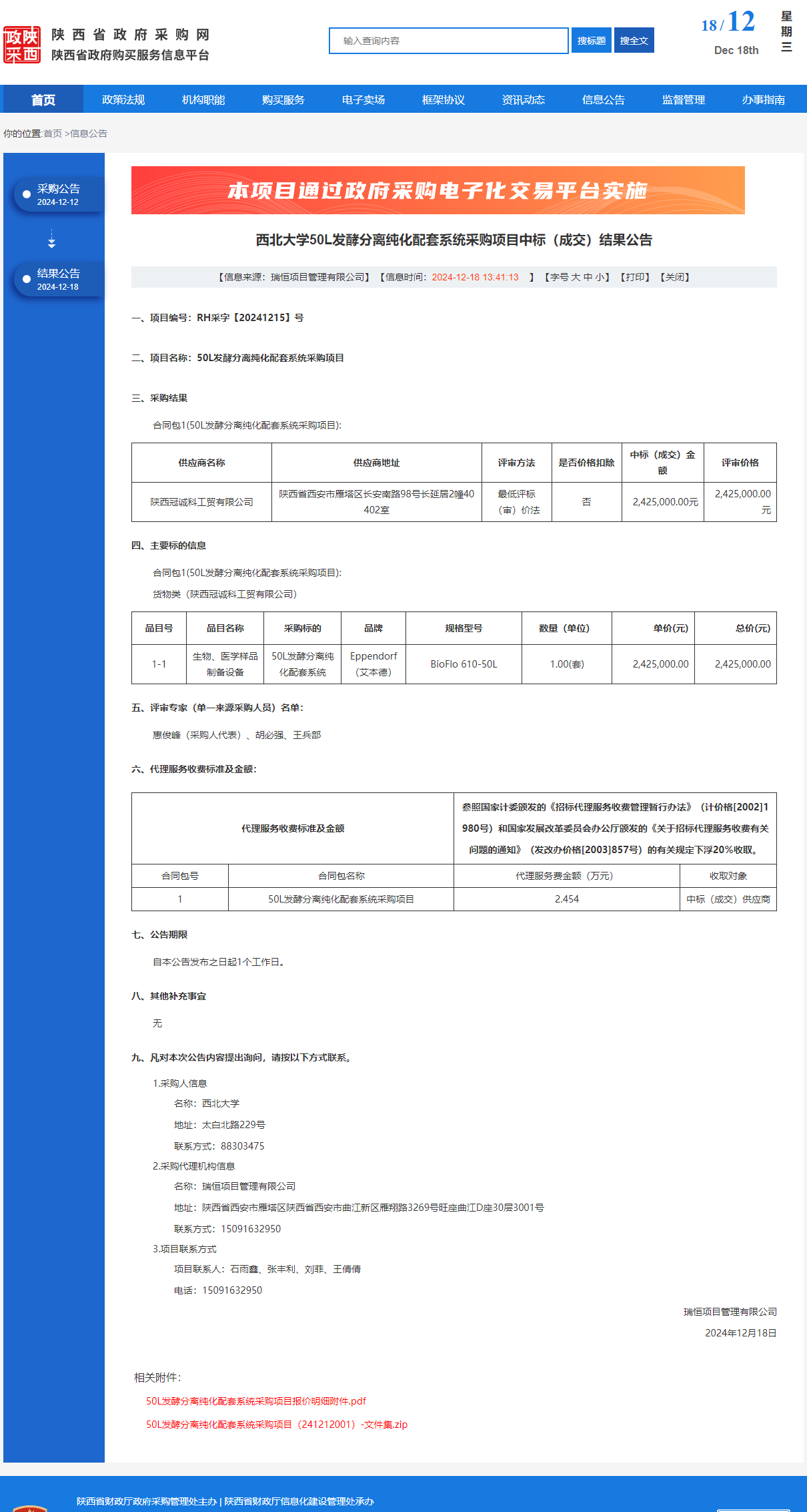 乐投平台50L发酵分离纯化配套系统采购项目中标(成交)结果公告 作者:采购与招标办公室 编辑: 时间:2024-12-18 原公告链接:https://www.ccgp-shaanxi.gov.cn/freecms/site/shaanxi/ggxx/info/2024/8a69c5a59218576d0193d83e10003654.html