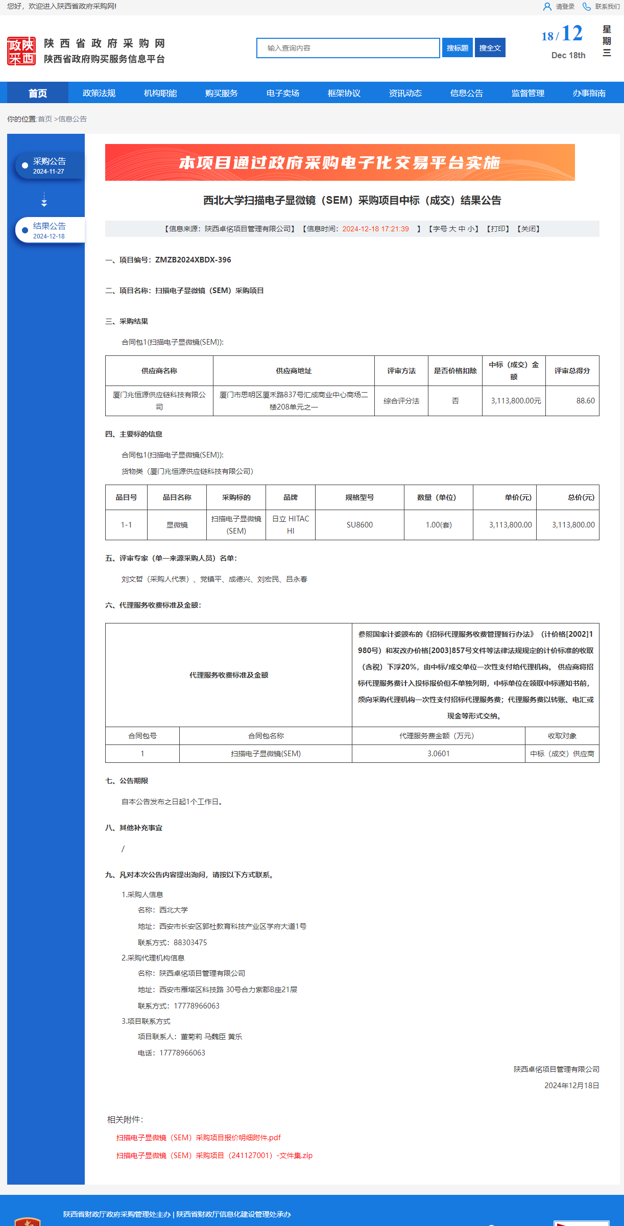 乐投平台扫描电子显微镜(SEM)采购项目中标(成交)结果公告 作者:采购与招标办公室 编辑: 时间:2024-12-18 原公告链接:https://www.ccgp-shaanxi.gov.cn/freecms/site/shaanxi/ggxx/info/2024/8a69c95d921859f00193d90183470ad8.html?noticeType=001021¬iceId=1e709926-bd23-11ef-8063-08c0eb20c666