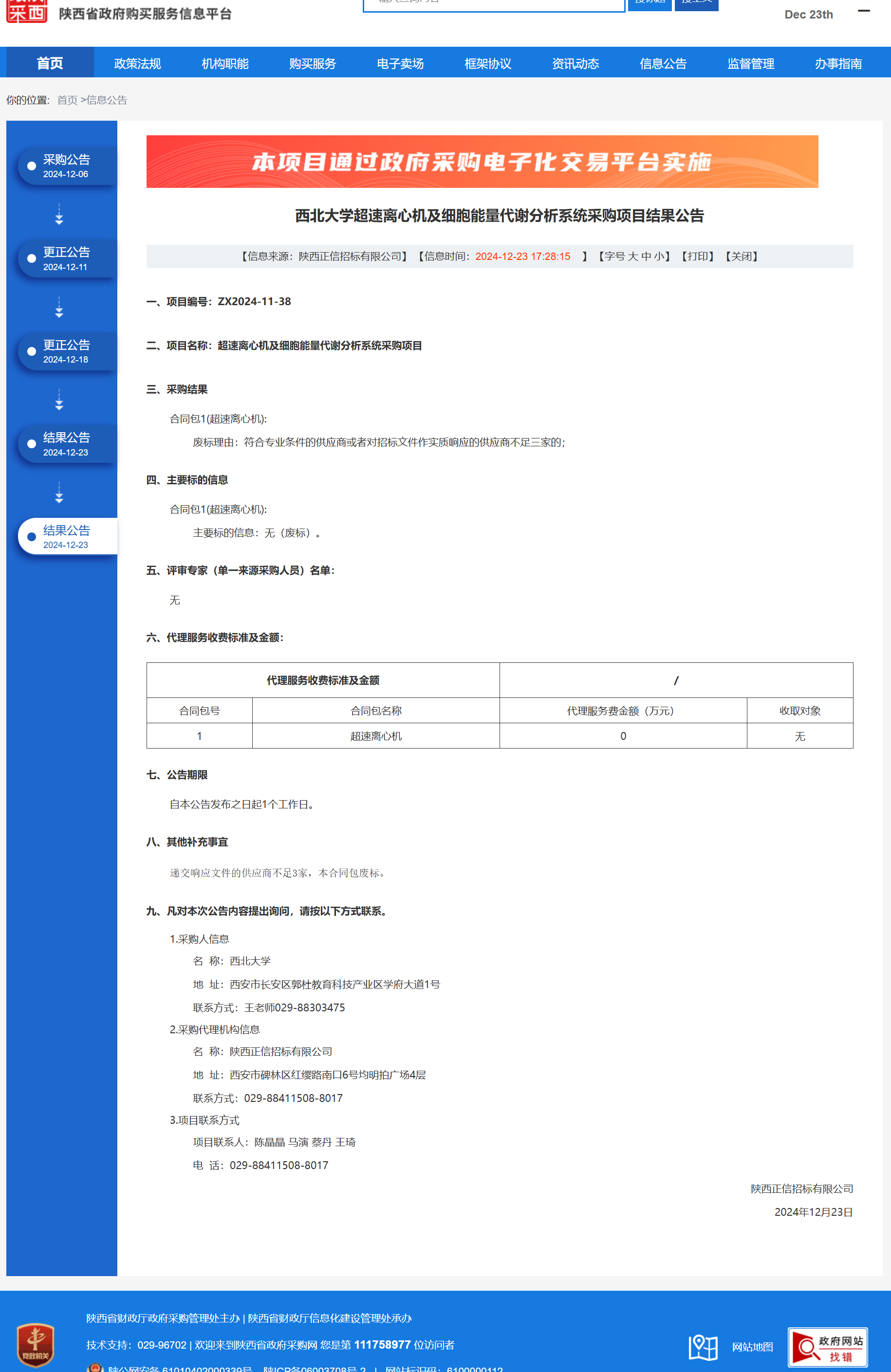 乐投平台超速离心机及细胞能量代谢分析系统采购项目结果公告 作者:采购与招标办公室 编辑: 时间:2024-12-23 原公告链接:https://www.ccgp-shaanxi.gov.cn/freecms/site/shaanxi/ggxx/info/2024/8a69c5a59218576d0193f2b7cd521246.html?noticeType=001006¬iceId=e0b5db84-c111-11ef-8063-08c0eb20c666