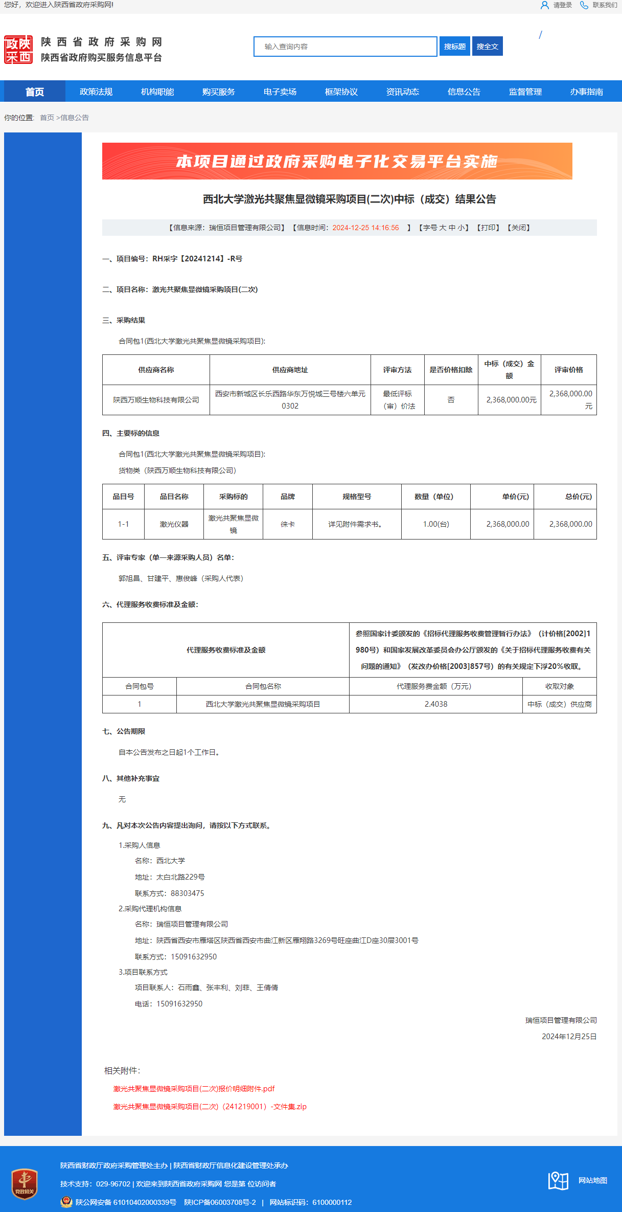 乐投平台激光共聚焦显微镜采购项目(二次)中标(成交)结果公告 作者:采购与招标办公室 编辑: 时间:2024-12-25 原公告链接:http://www.ccgp-shaanxi.gov.cn/freecms/site/shaanxi/ggxx/info/2024/8a69c251921857370193fc6fdab73efc.html