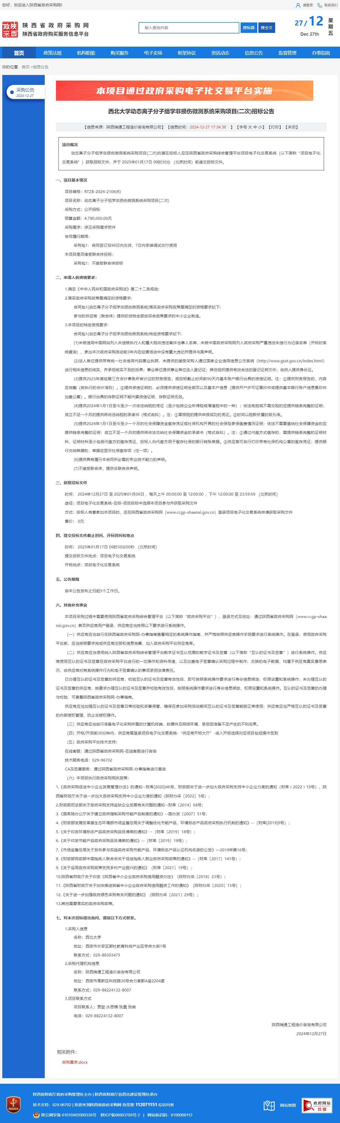 乐投平台动态离子分子组学非损伤微测系统采购项目(二次)招标公告 作者:采购与招标办公室 编辑: 时间:2024-12-27 原公告链接:http://www.ccgp-shaanxi.gov.cn/freecms/site/shaanxi/ggxx/info/2024/8a69c5a59218576d019407700c364918.html?noticeType=001011¬iceId=6f721510-c437-11ef-8063-08c0eb20c666