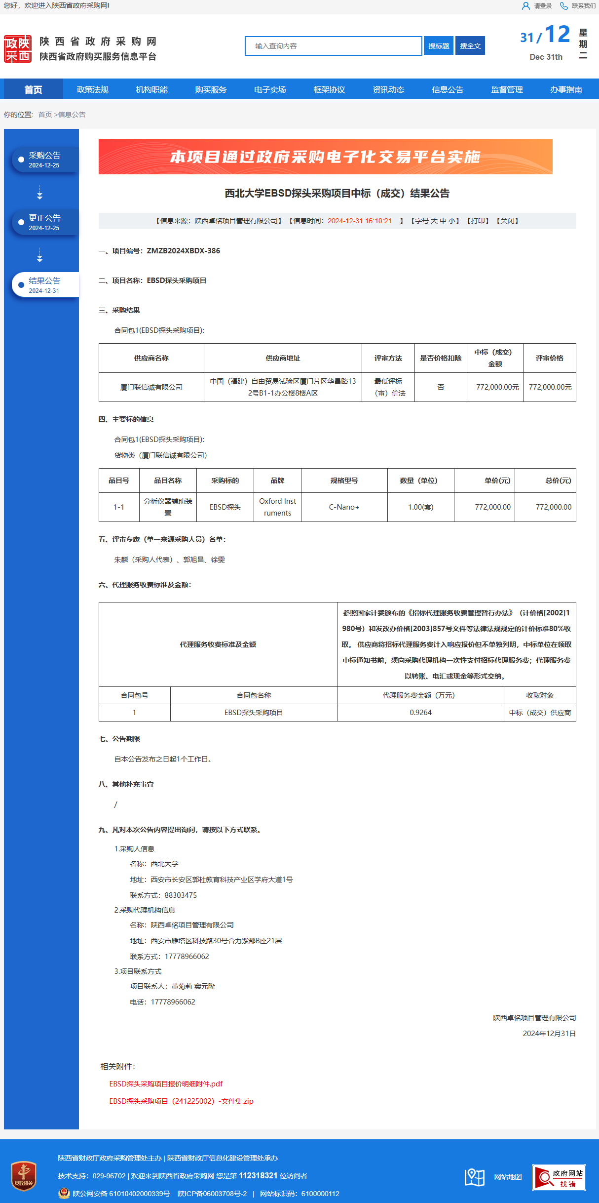 乐投平台EBSD探头采购项目中标(成交)结果公告 作者:采购与招标办公室 编辑: 时间:2024-12-31 原公告链接:https://www.ccgp-shaanxi.gov.cn/freecms/site/shaanxi/ggxx/info/2024/8a69c44e9218572b01941bbf3cfd0e2a.html?noticeType=001023¬iceId=56151531-c750-11ef-8063-08c0eb20c666