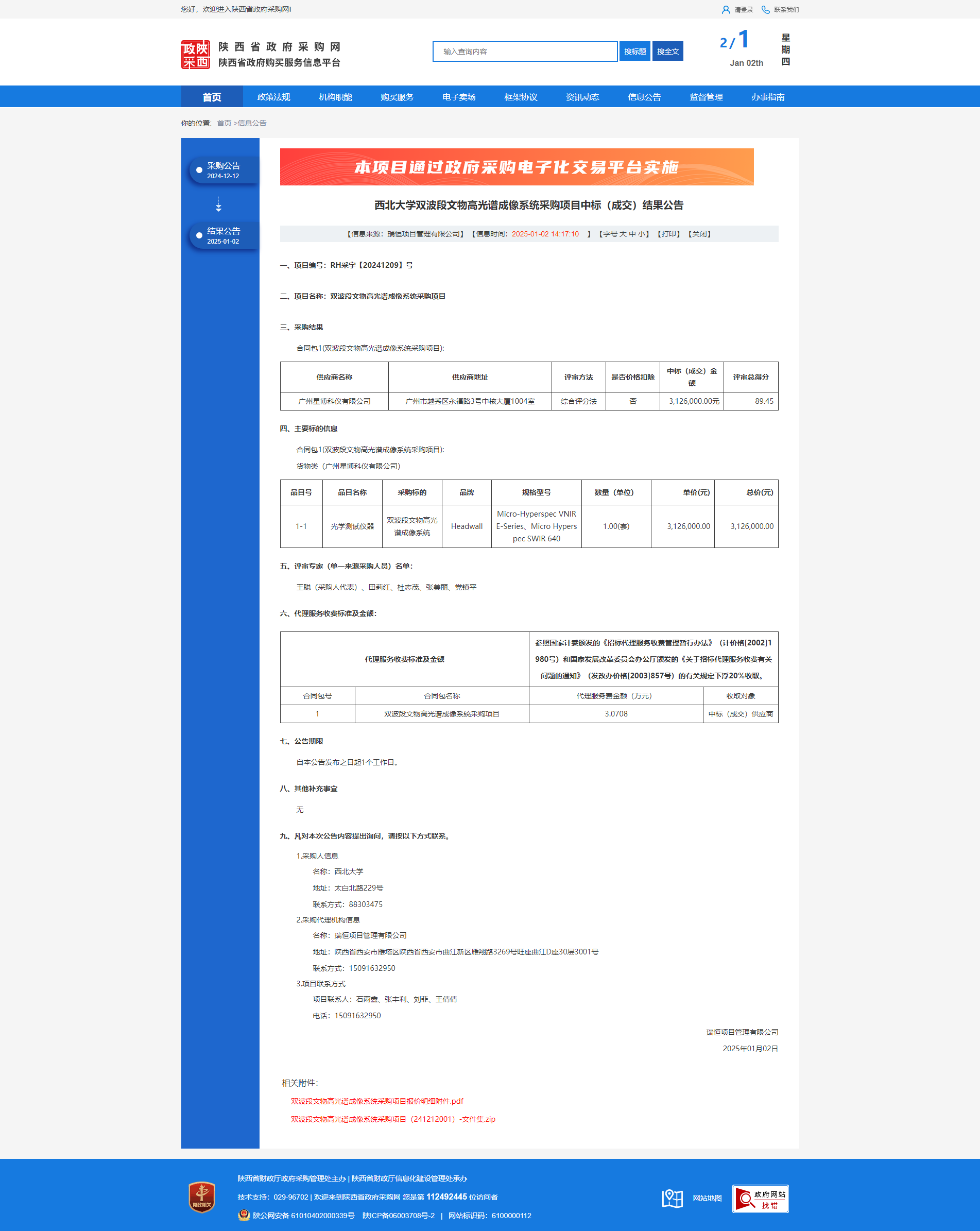 乐投平台双波段文物高光谱成像系统采购项目中标(成交)结果公告
