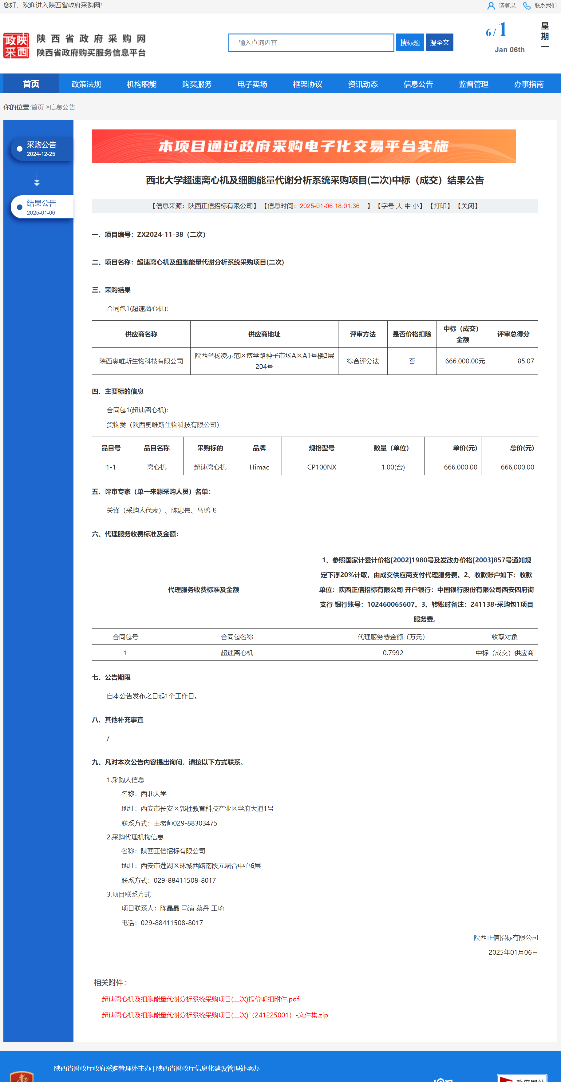 乐投平台超速离心机及细胞能量代谢分析系统采购项目(二次)中标(成交)结果公告 作者:采购与招标办公室 编辑: 时间:2025-01-06 原公告链接:https://www.ccgp-shaanxi.gov.cn/freecms/site/shaanxi/ggxx/info/2025/8a69c2519218573701943b083d2b112d.html?noticeType=001026¬iceId=e26ca62a-cc16-11ef-8063-08c0eb20c666