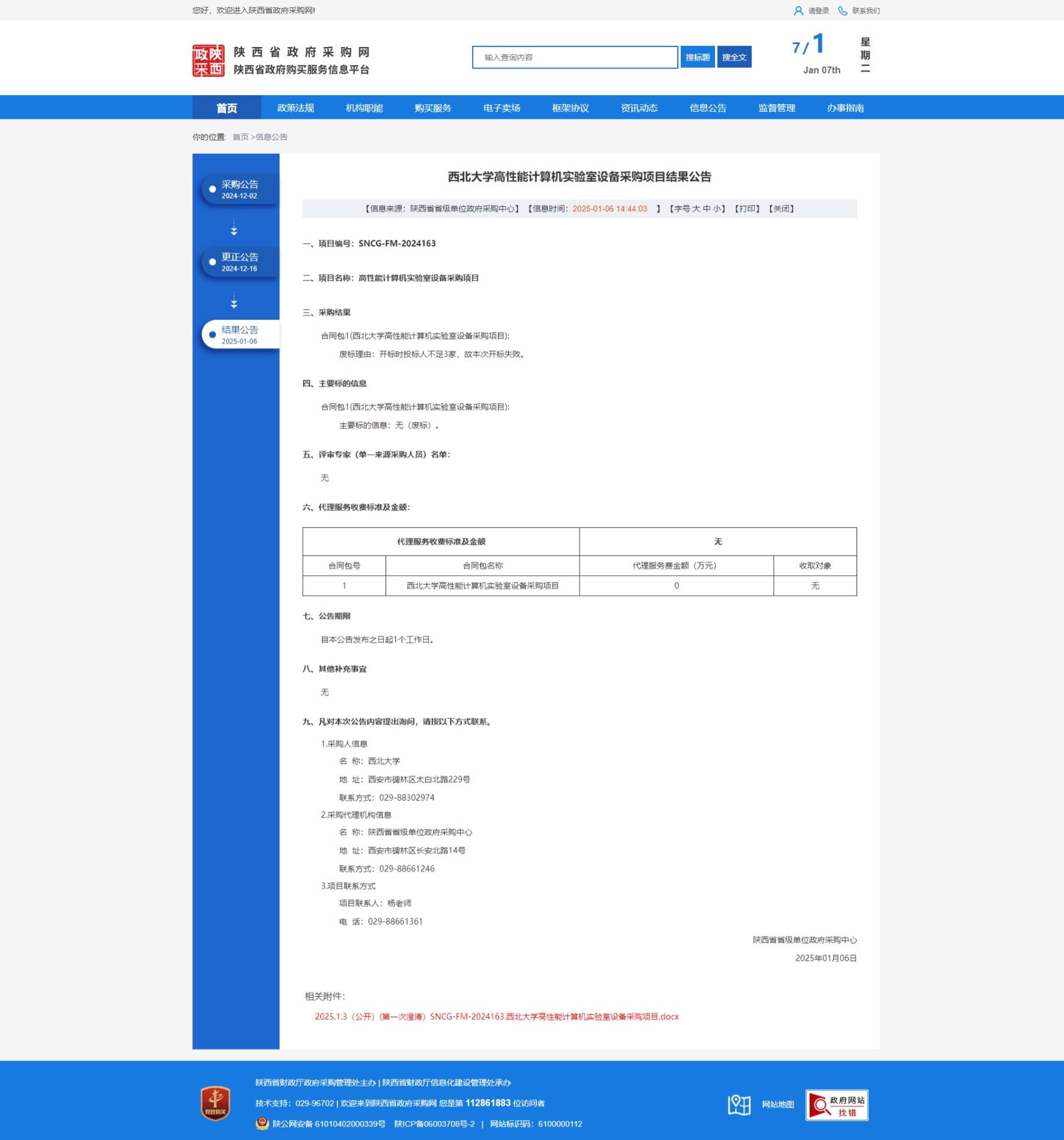 乐投平台高性能计算机实验室设备采购项目结果公告 作者: 编辑:薛利娟 时间:2025-01-07 原公告链接:https://www.ccgp-shaanxi.gov.cn/freecms/site/shaanxi/ggxx/info/2025/8a69c95d921859f001943992fed82bb1.html?noticeType=001006¬iceId=49269ef4-cbfb-11ef-8063-08c0eb20c666