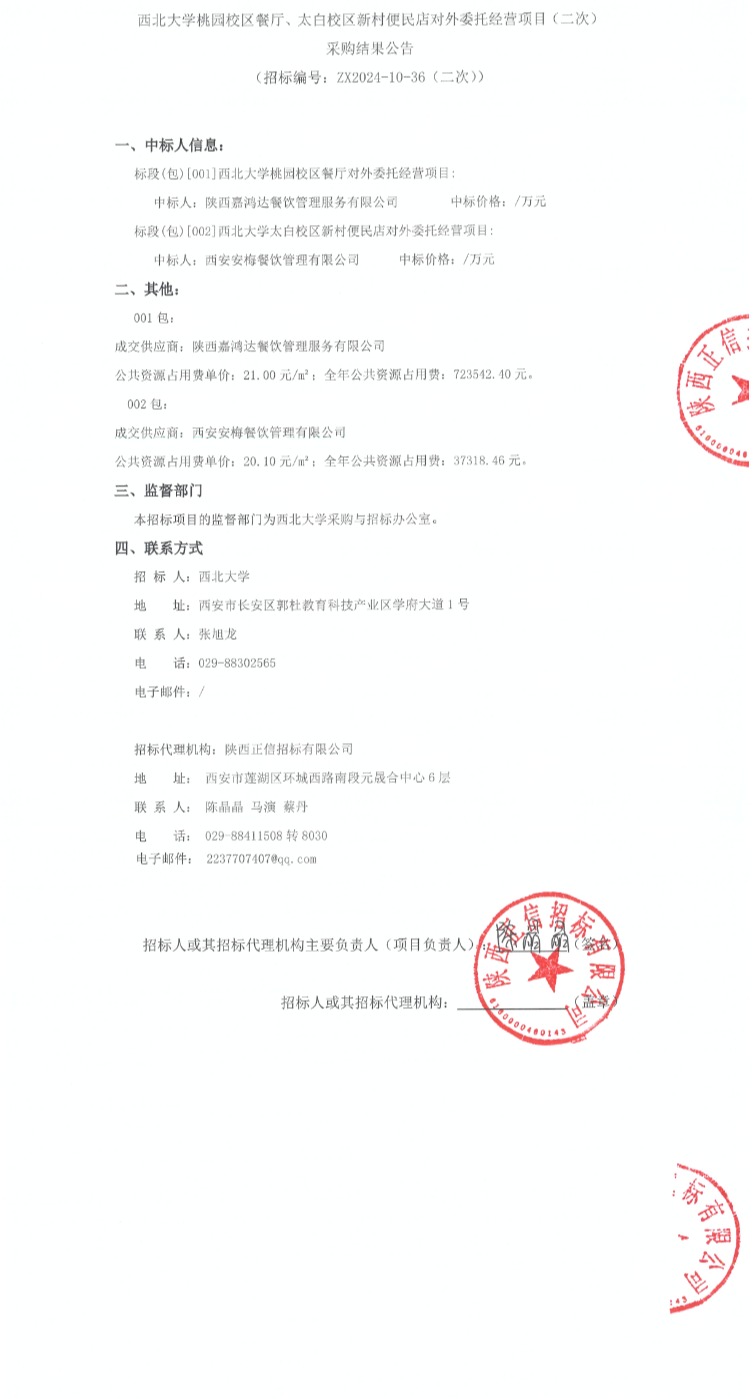 乐投平台桃园校区餐厅、太白校区新村便民店对外委托经营项目(二次)采购结果公告