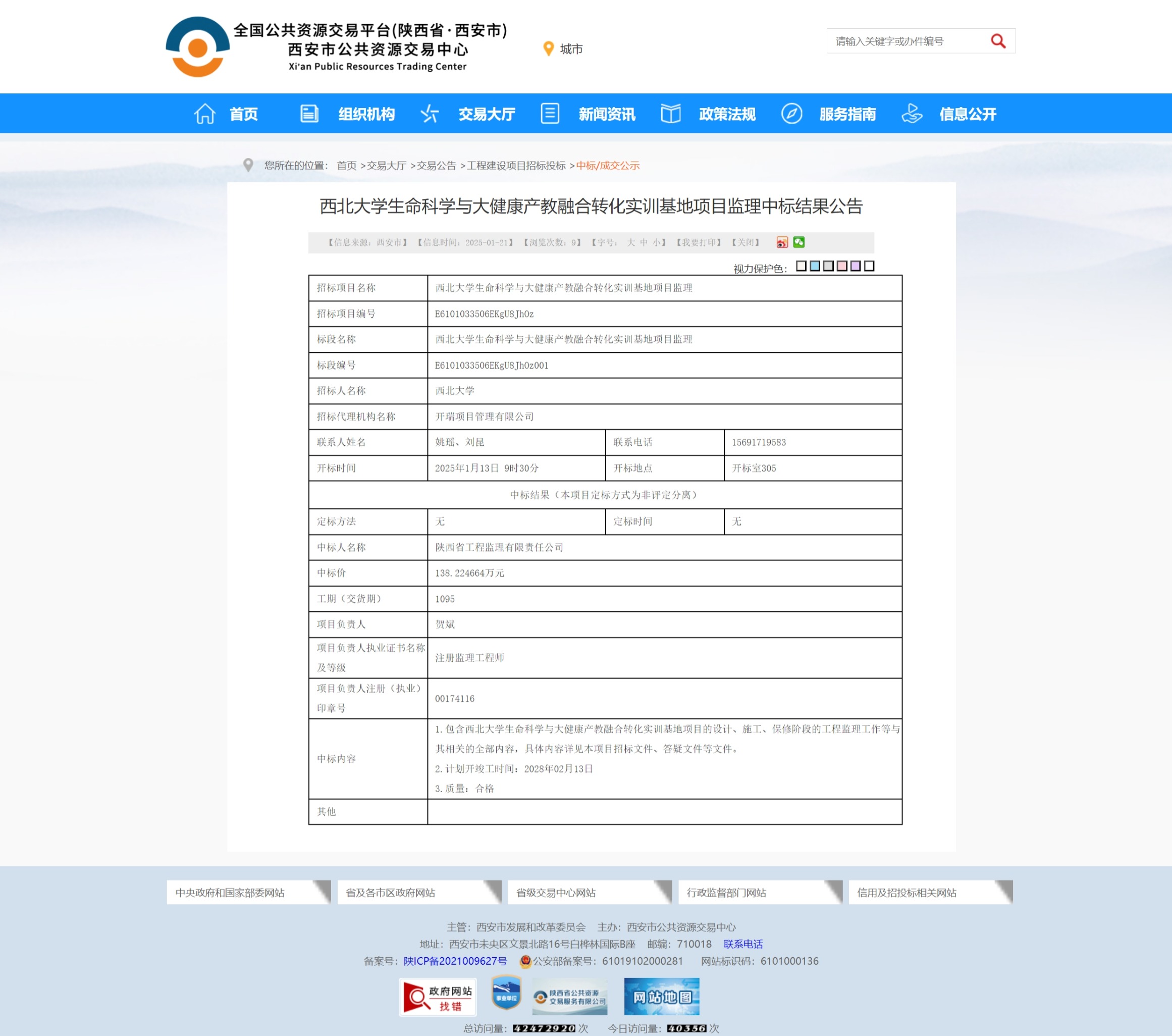 乐投平台生命科学与大健康产教融合转化实训基地项目监理中标结果公告