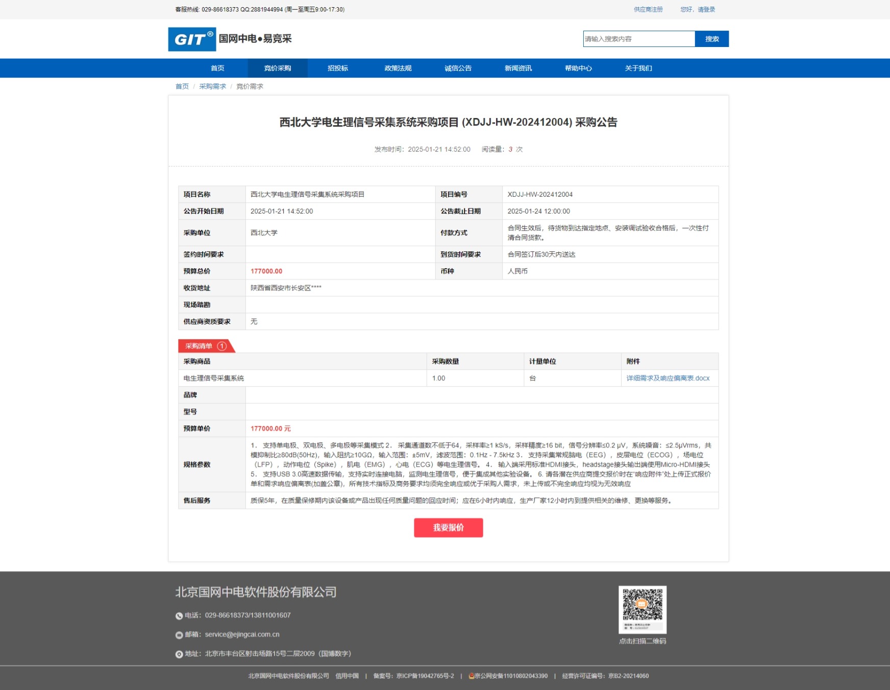 乐投平台电生理信号采集系统采购项目 (XDJJ-HW-202412004) 竞价采购公告 作者: 编辑: 时间:2025-01-21 原公告链接:https://www.ejingcai.com.cn/site/bidding/detail/16443